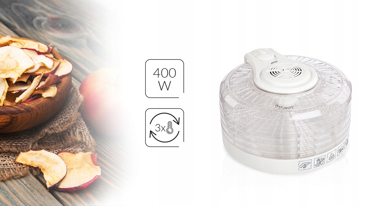 Поток воздуха можно установить на один из трех уровней мощности. Для продуктов с более высокой влажностью потребуется самая высокая температура воздуха.