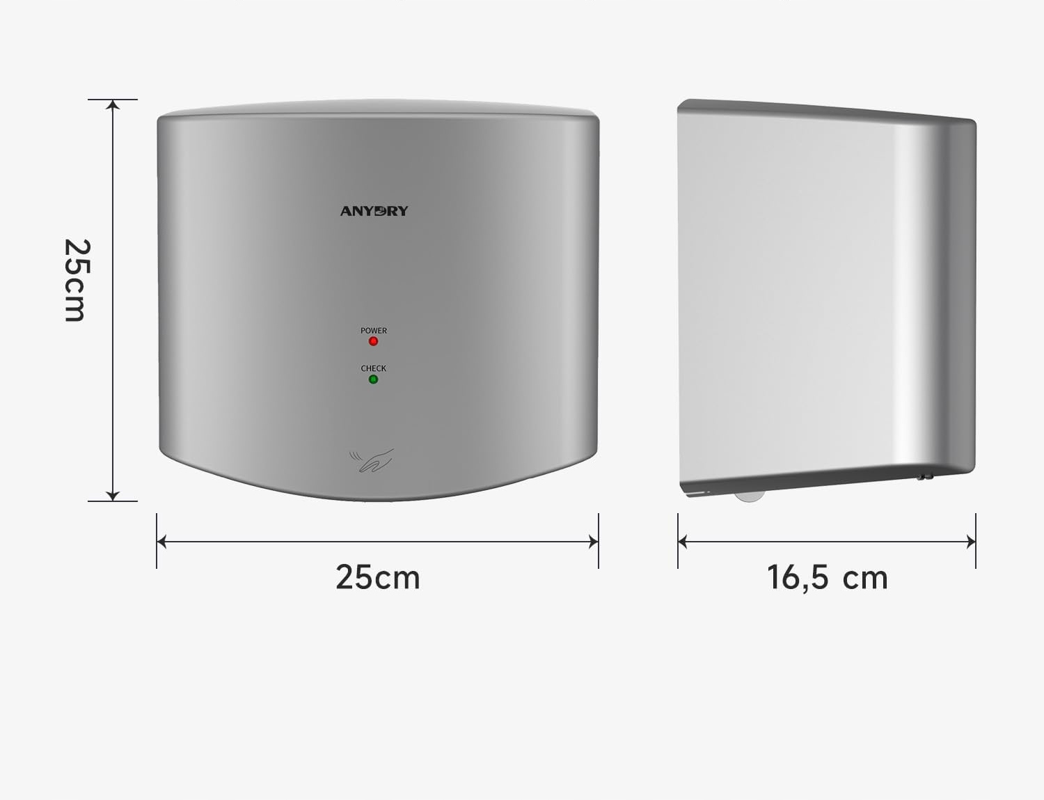 Быстро: сушилка для рук Anydry чувствительна и долговечна: она начинает сушить руки уже через 0,2 секунды. Воздуховыпускное отверстие шириной 15 см создает мощный поток, окутывающий ваши руки и быстро удаляющий капли воды с кожи за 10 секунд.