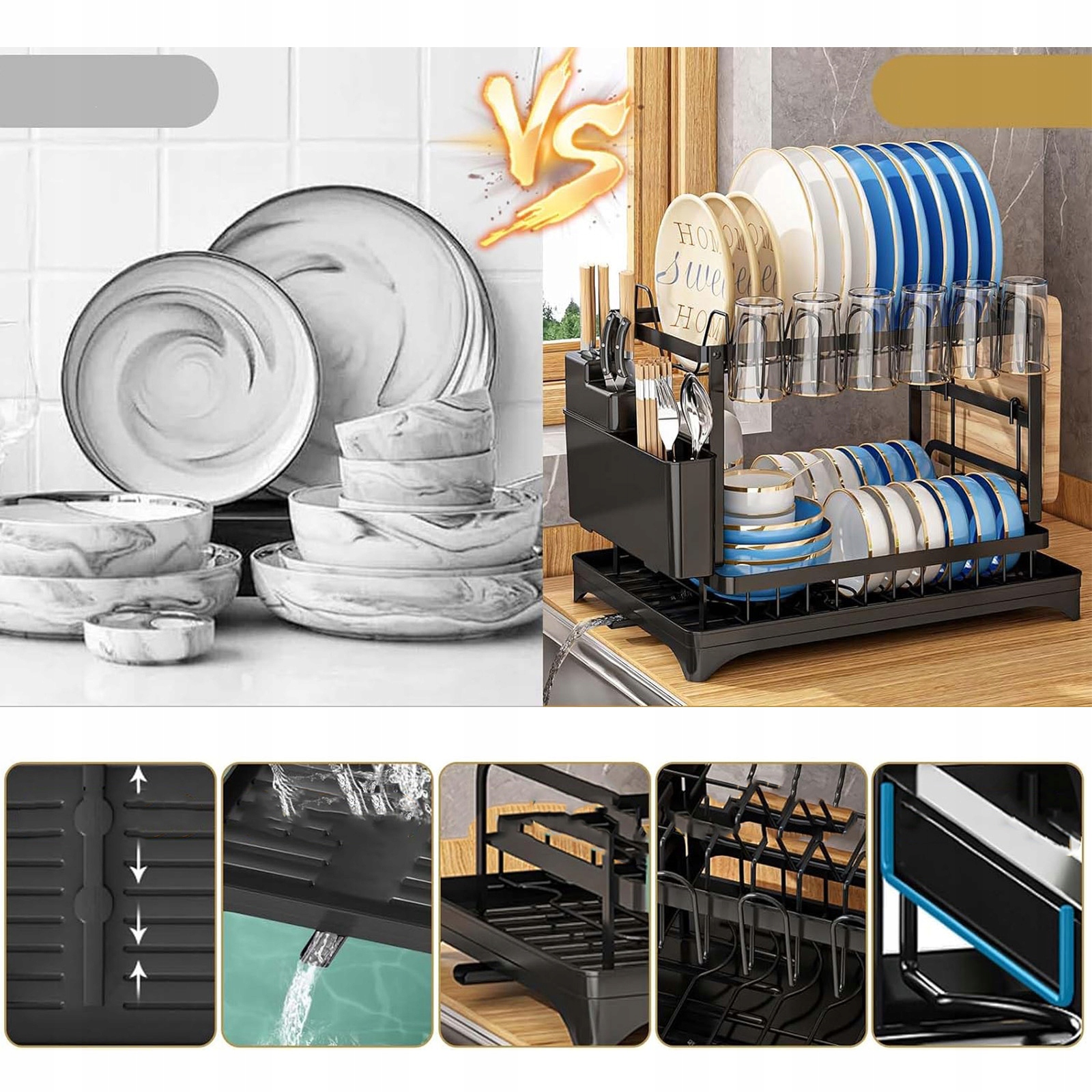 Эти двухуровневые блюда на блюдах предлагают много места для хранения различных видов сосудов, мисок, чашек, очков, ножей и ложки. У него также есть специальные подстаканники, рубку и столовые приборы, что позволяет еще лучшей организации космоса.