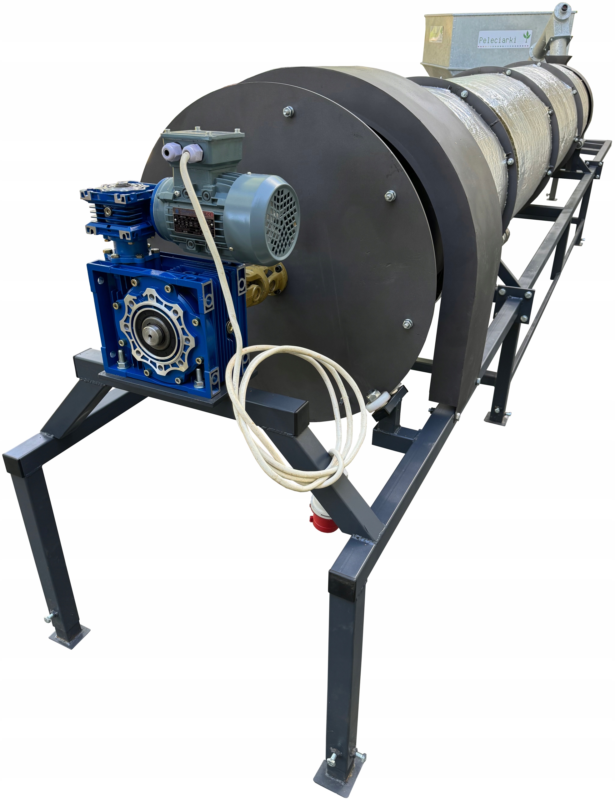 Сушилка представляет собой многофункциональное устройство, которое благодаря небольшим размерам можно разместить на ограниченной площади (достаточно 14 м² – общая длина 6 м). Благодаря использованию двигателя мощностью 0,37 кВт с очень прочной передачей сушка становится экономичной, а масляный нагреватель (дизель, топливо) мощностью 50 кВт, используемый в качестве источника тепла, обеспечит эффективную сушку, быстро удаляя влагу из высушенного материала. материал. Материал в сушилку подается с помощью шнекового питателя, оснащенного инвертором, мотор-редуктором, термозащитой, смесителем и удлинителем, что значительно облегчит нам работу и позволит управлять сушилкой одному человеку. Благодаря использованию системы лопастей (как в питателе, так и в сушилке), размещенных внутри барабана, высушенный материал пересыпается, циркулирует, аэрируется и транспортируется. Сама сушильная камера имеет высоту 4 метра и дополнительно утеплена минеральной ватой, что предотвращает потери тепла. Барабан установлен на раме из стальных профилей. Рама опирается на вращающиеся колеса, применение двойного редуктора от двигателя к валу, приводящему в движение сушильный барабан, позволяет ограничить вращение барабана, благодаря чему материал дольше остается в сушильной камере, что обеспечивает эффективную сушку в течение относительно небольшая длина барабана.