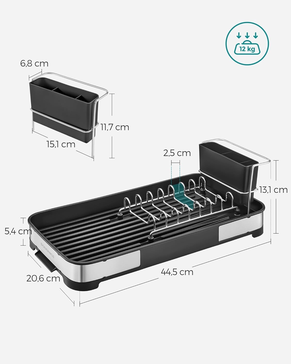 Прочный высококачественный материал: попрощайтесь с подставками для блюд, которые ржавеют с течением времени. Songmics Shelf - идеальное решение. Изготовленная из чистотой из нержавеющей стали с высоким качеством, сушилка для блюд устойчиво к ржавчине, маслам и отпечаткам пальцев и предназначена для частого использования. Без проблем! Благодаря компактным размерам, это блюдо идеально подходит для небольших рабочих поверхностей. В нем размещаются 7 тарелок, много мисок или чашек и оснащен 3-департаментом держателя столовых работ, благодаря тому, что ваши блюда будут заказаны и легко доступны.