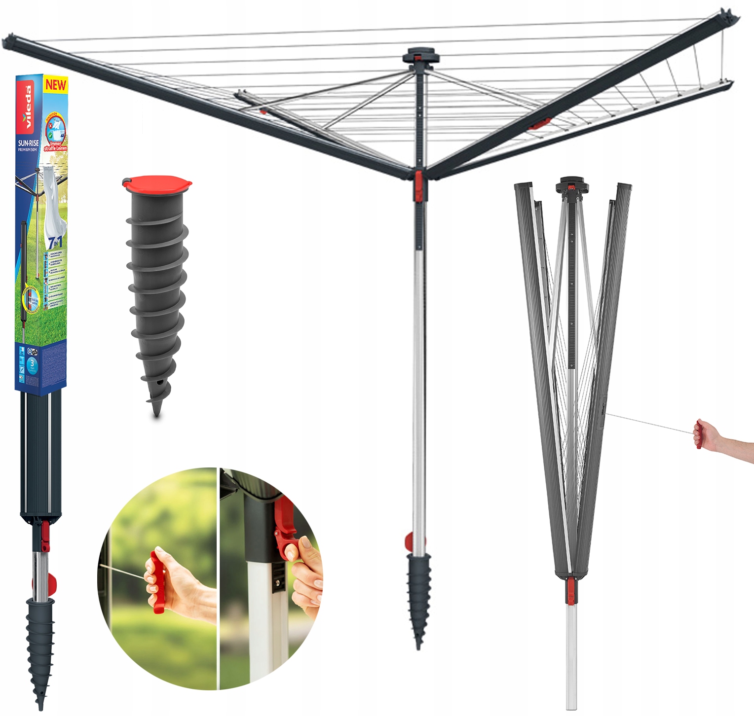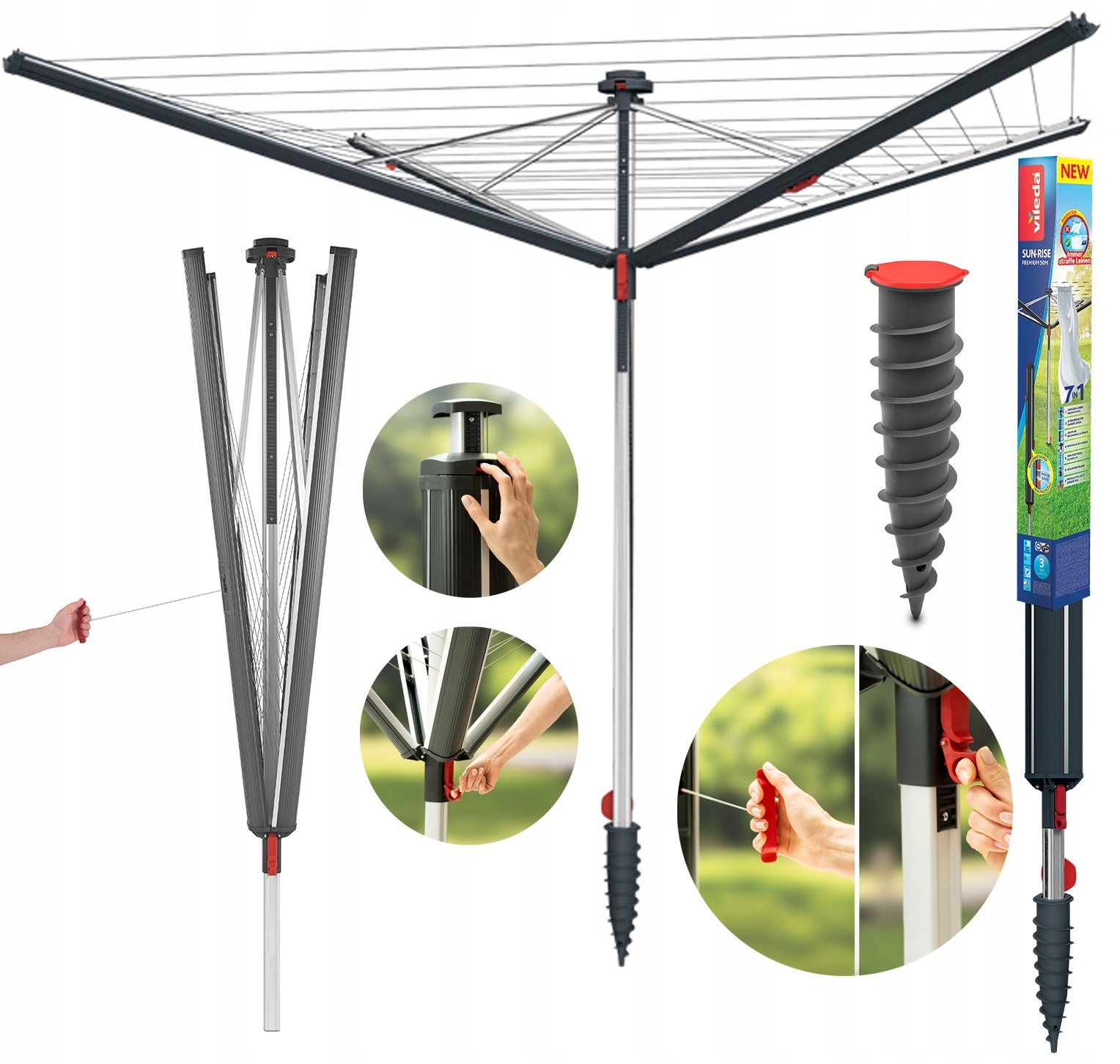 ✅ Vileda Sun-Rise Premium 50 — роторная садовая сушилка, изготовленная на 100% из нержавеющего алюминия, что гарантирует ее устойчивость к атмосферным воздействиям.