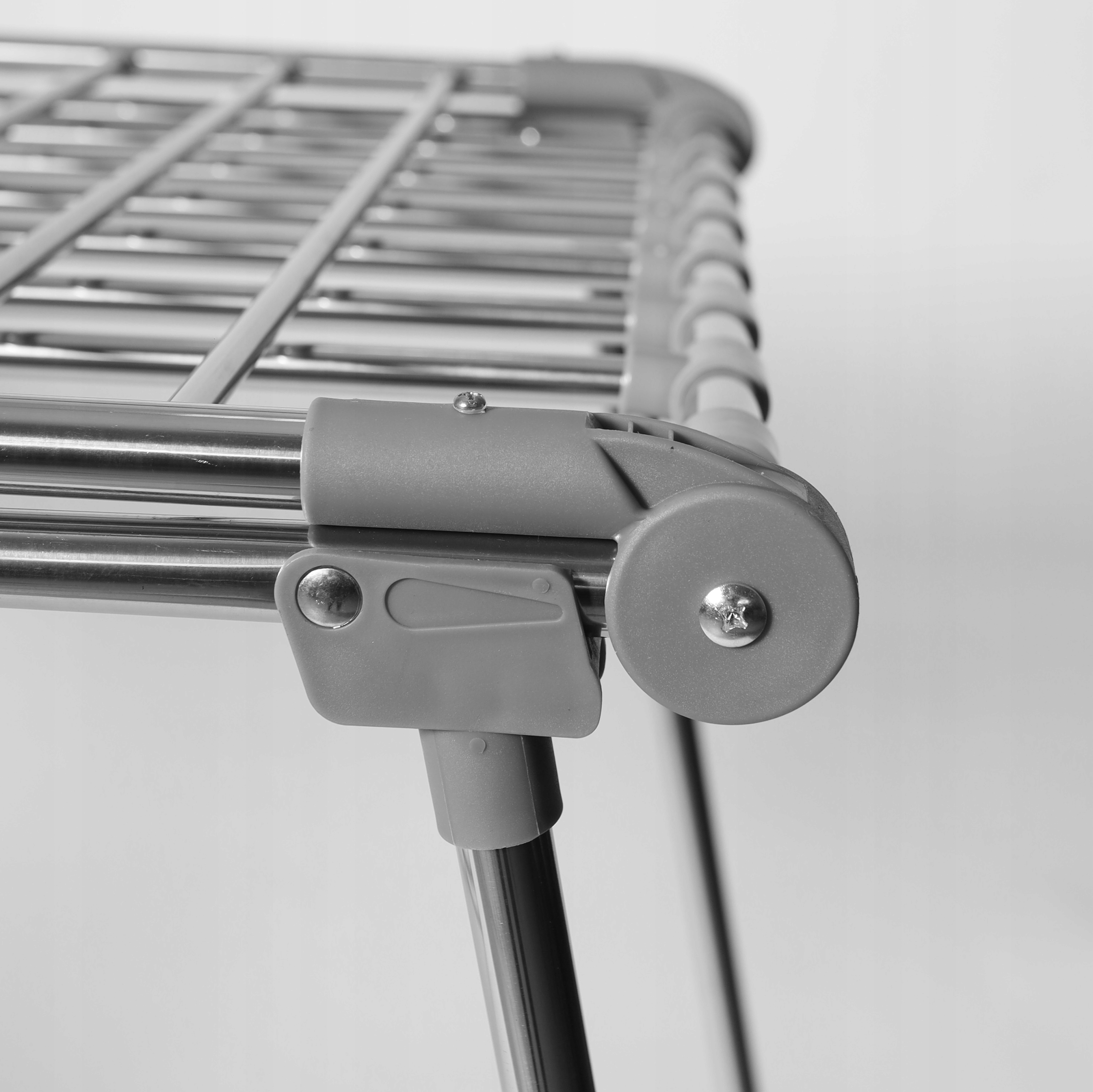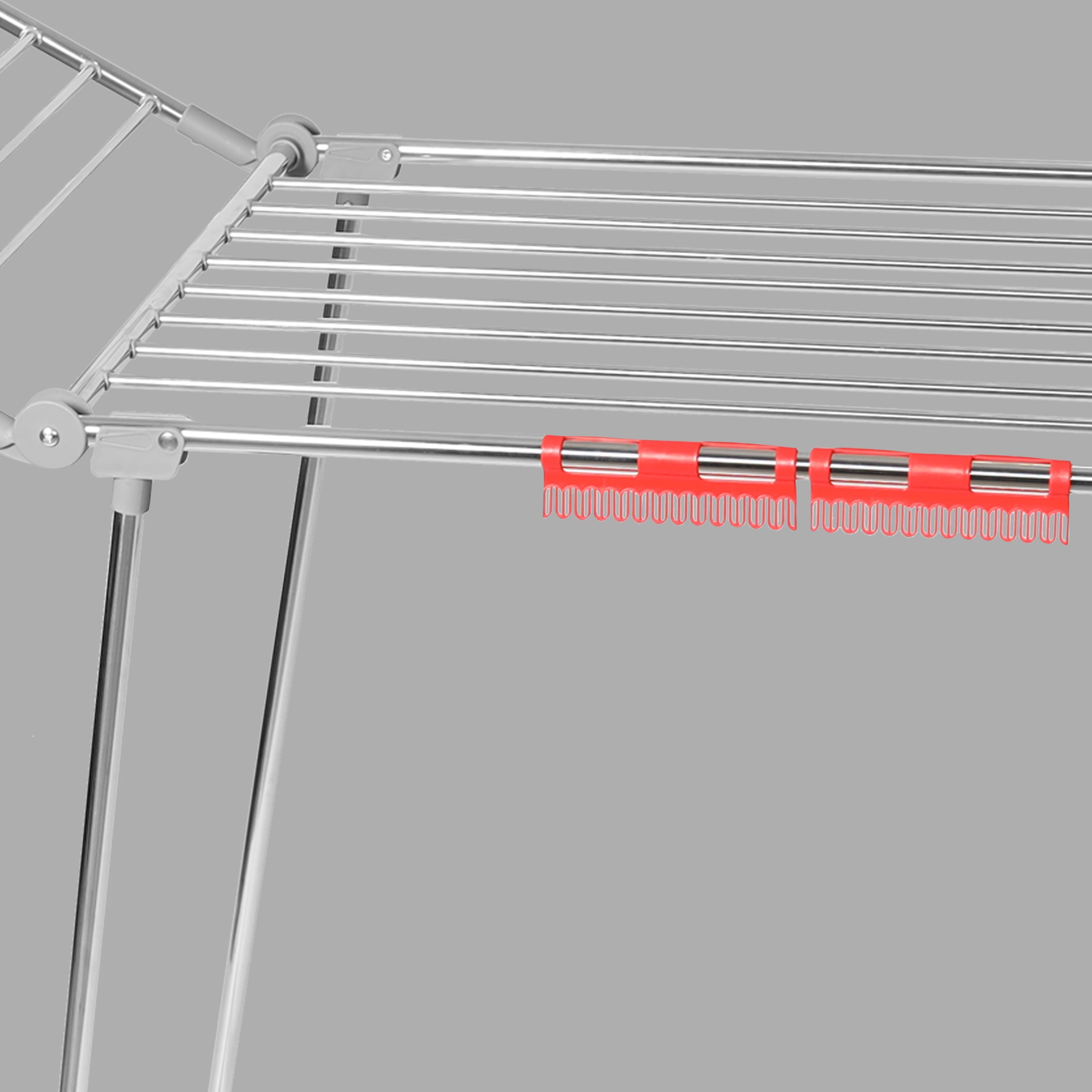 Складная сушилка - отличный выбор для каждой фермы дом. Изготовлен из высококачественной углеродистой стали в серебре, он гарантирует длительную прочность и стабильность. Возможность развертывания до 27 метров прачечной и Максимальная нагрузка до 20 кг делает его чрезвычайно продуктом Функциональный и устойчивый к высоким нагрузкам. Практические крючки на нижнее белье и носки дополнительно увеличивают его удобство использования, делая его Ежедневное домашнее задание намного проще.