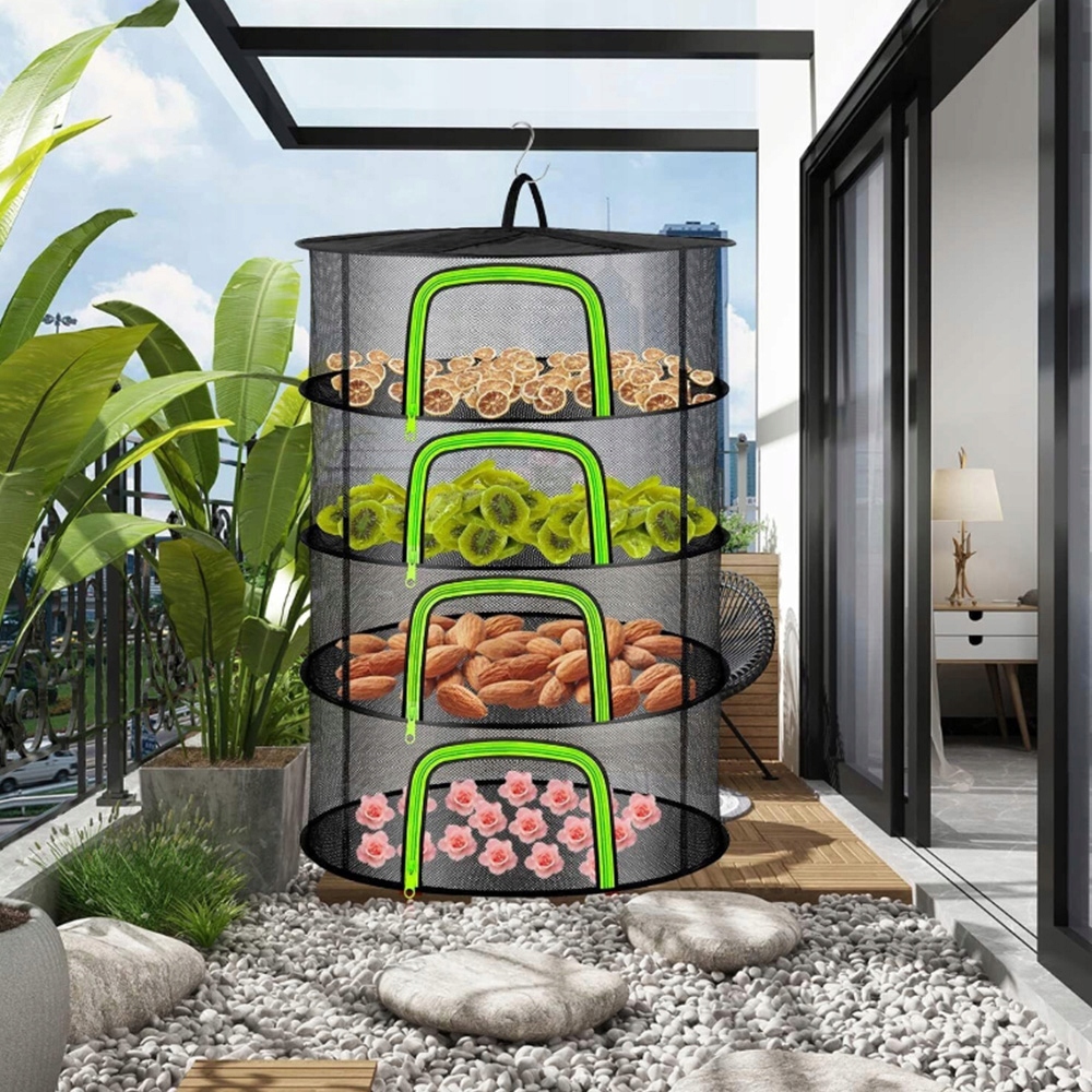 4-слойный резак от сетки до висящих трав, диаметр распределенного составляет 60 см, высота каждого слоя составляет 20 см, а общая высота-80 см. Каждый этаж предоставляет много места для сушки многих растений и трав. Каждый слой имеет независимую молнию, которую можно отсортировать и высохнуть, чтобы избежать смешивания. Вертикальный дизайн очень эффективно использует пространство.