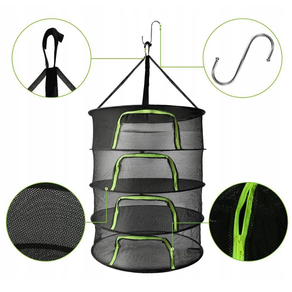 Творбная сушилка изготовлена из очень гибкой, очень прочного полиэстера с тонкой сеткой, которая дышат и вентилируется, благодаря которой растения высыхают по центру. Каждый слой имеет встроенное кольцо из нержавеющей стали, которое обеспечивает стабильное удержание и не деформируется даже после длительного использования.