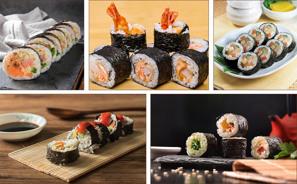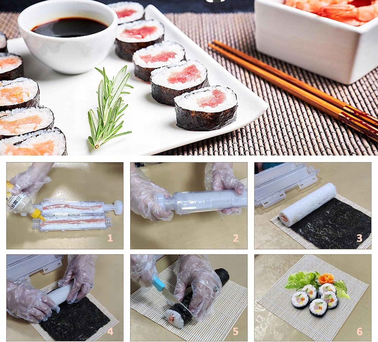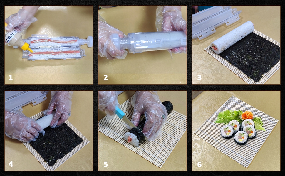 Легкие суши: это сразу же превращает вас в повар суши! Все, что вам нужно сделать, это нанести уксус на суши на внутреннюю часть модели суши, а затем положить рис и любимые суши ингредиенты на вал суши. Затем закройте вал к суши, чтобы заблокировать закрытие, затяните поршень под давлением суши на обоих концах, а затем откройте суши -машину, налейте рисовый шарик на нори (водоросль), используйте бамбуковый коврик, чтобы обернуть рисовый шарик морским водорослем, и у вас есть восхитительный рулет суши! Сэкономьте время и деньги!