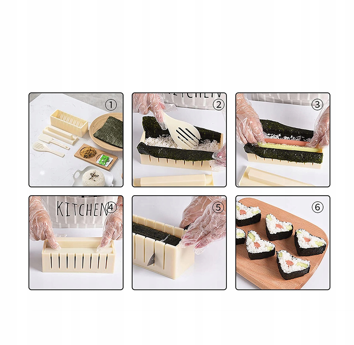 (В комплект входят: 1 рисовая вилка, 1 лопаточка с антипригарным покрытием, две пары палочек для еды. 8 формочек для суши, в том числе: треугольник, сердце, классический круглый, маленький квадрат, прямоугольник, форма животного, полукруг, веерная форма)