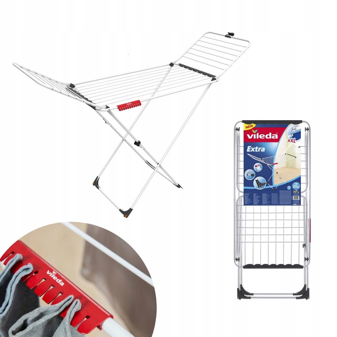 Представленный Вам продукт – это сушилка для белья Vileda EXTRA. Сушилка для белья Vileda Extra имеет площадь 20 м². Толстые алюминиевые тросы для подвешивания уменьшают количество складок, благодаря чему глажка становится менее трудоемкой. Встроенные в основание колеса обеспечивают удобное перемещение.