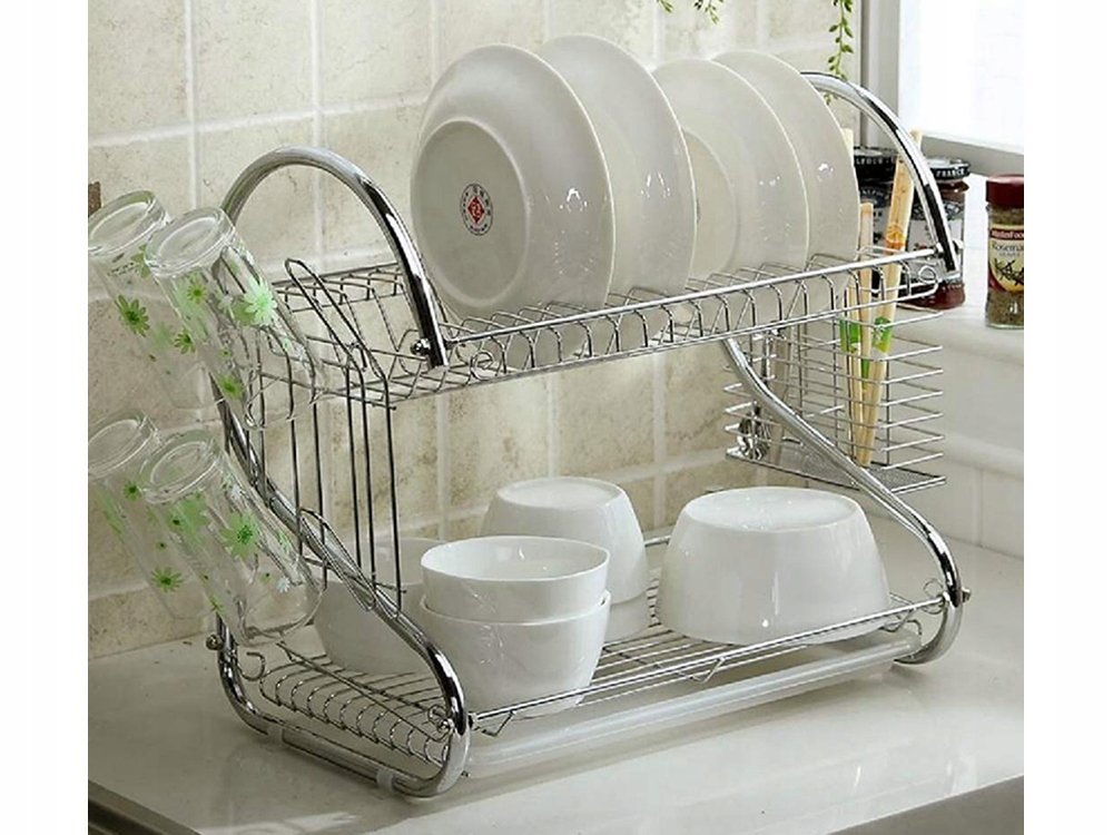 Двухуровневая сушилка для посуды — незаменимая техника на каждой кухне. Он очень практичен и имеет два уровня, на которых можно разместить большое количество тарелок, мисок и стаканов. Кроме того, он имеет две ручки для подвешивания. Один для столовых приборов, другой для стаканов.