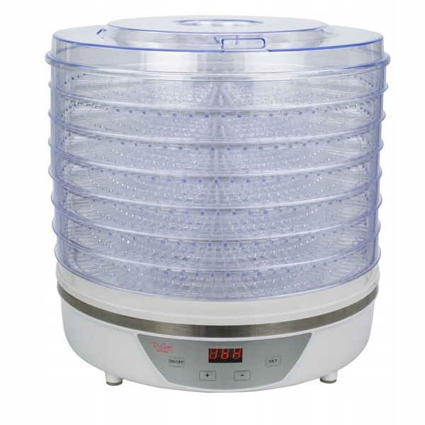 Электросушилка обеспечивает равномерную сушку овощей и фруктов за счет циркуляции горячего воздуха; Имеется целых 7 лотков, на которых можно разместить продукты. Прозрачная крышка облегчает контроль над процессом сушки, а четкий светодиодный дисплей отображает текущую температуру внутри устройства.