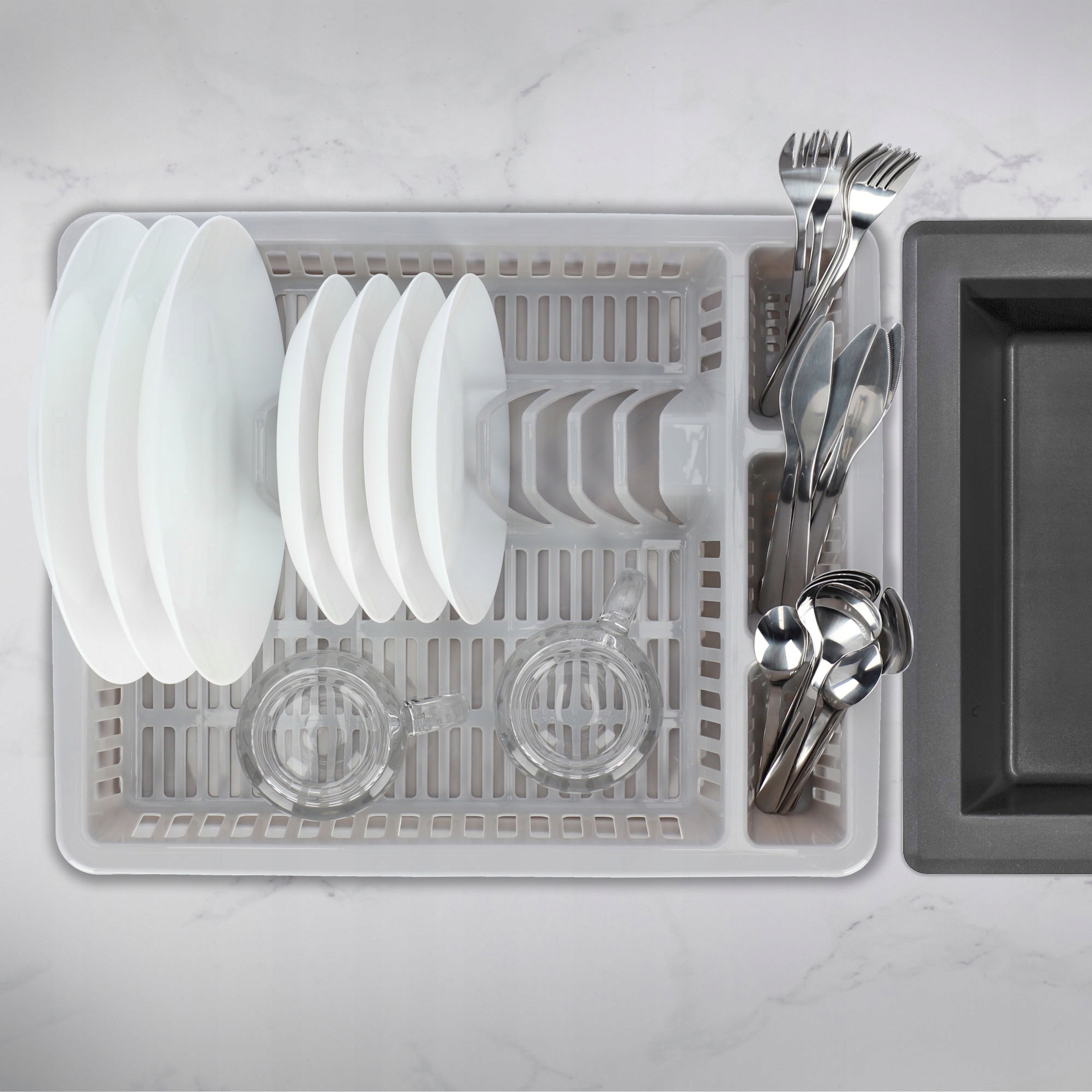 - Четыре камеры, пластиковые ребра и отдельные отверстия для столовых приборов позволяют сушите как небольшую посуду, такую как чашки или маленькие тарелки, так и более крупные предметы, такие как разделочные доски, кастрюли, сковородки или кувшины.
