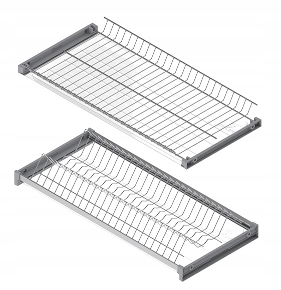 Двухуровневая сушилка для посуды на алюминиевом основании от Rejs, предназначенная для подвесных шкафов. Данная модель отличается новой конструкцией боковых креплений к кузову и профилям. Адаптировано для плит толщиной 16–19 мм. Предназначен для шкафа с внешним размером 800 мм. Верхняя часть сушилки предназначена для стаканов и кружек, а нижняя идеально подходит для тарелок разного типа. Он крепится на защелки, в которых имеются подготовленные отверстия. Оснащен двумя пластиковыми лотками, которые вставляются в ранее прикрепленные боковые крепления. Предложение распространяется на окрашенную модель ХРОМНЫЙ ЭФФЕКТ.