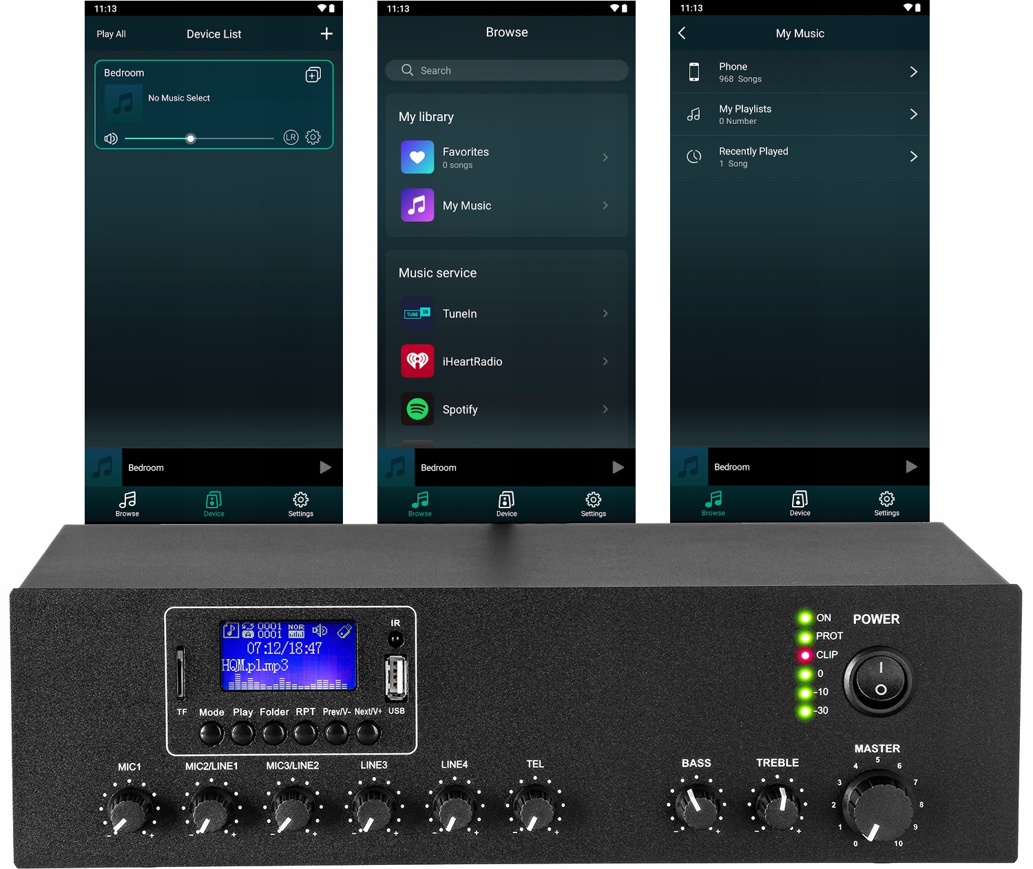 Усилитель выполняется с помощью смартфона с Android или iOS с использованием выделенных приложений . Internet Radio обеспечивает высокий качественный звук почти от каждой радиостанции, доступной в мире, а интеграция с музыкальными службами позволяет хранить и воспроизводить списки воспроизведения без необходимости постоянного сочетания смартфона с сетью.