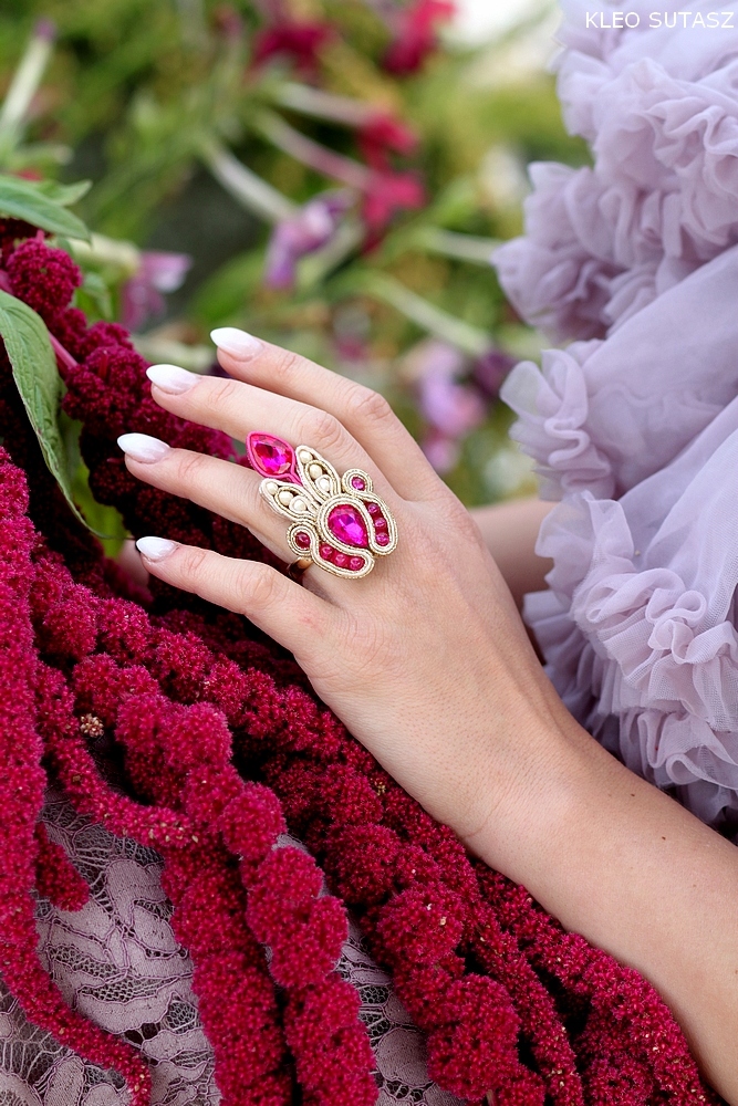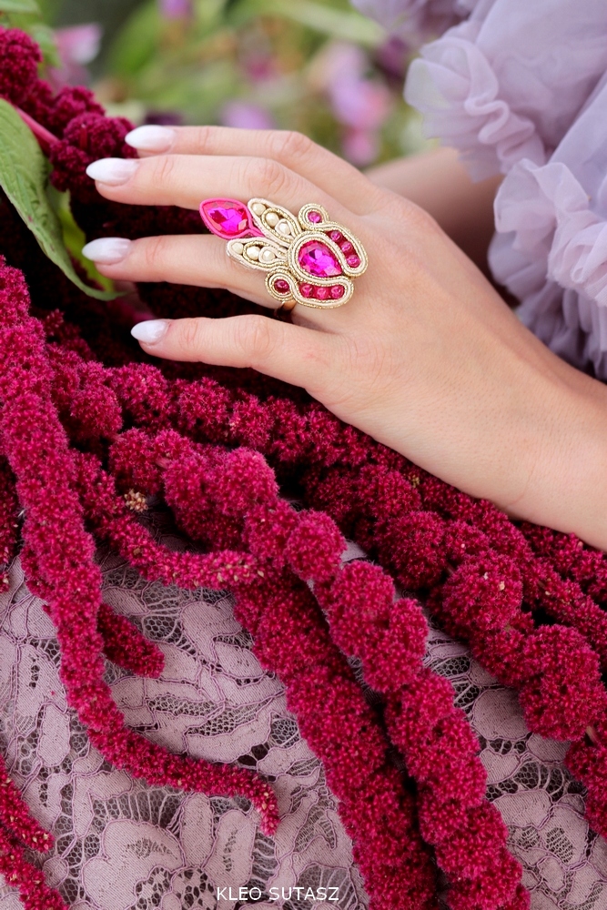 Сутажний перстень ФУКСІЯ ЗОЛОТО ДОВГИЙ КЛЕО