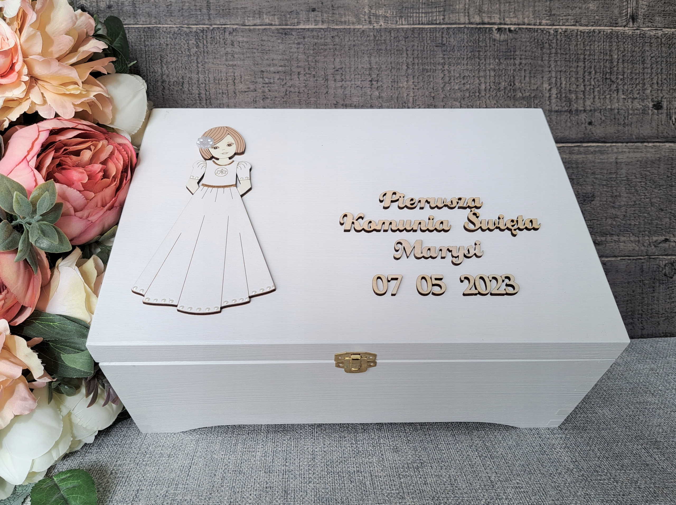 Крышка коробки была окрашена в белый цвет, а ее декоративный элемент - девушка, нарисованная нашими художниками в причастии. Нижняя и середина ствола белый.