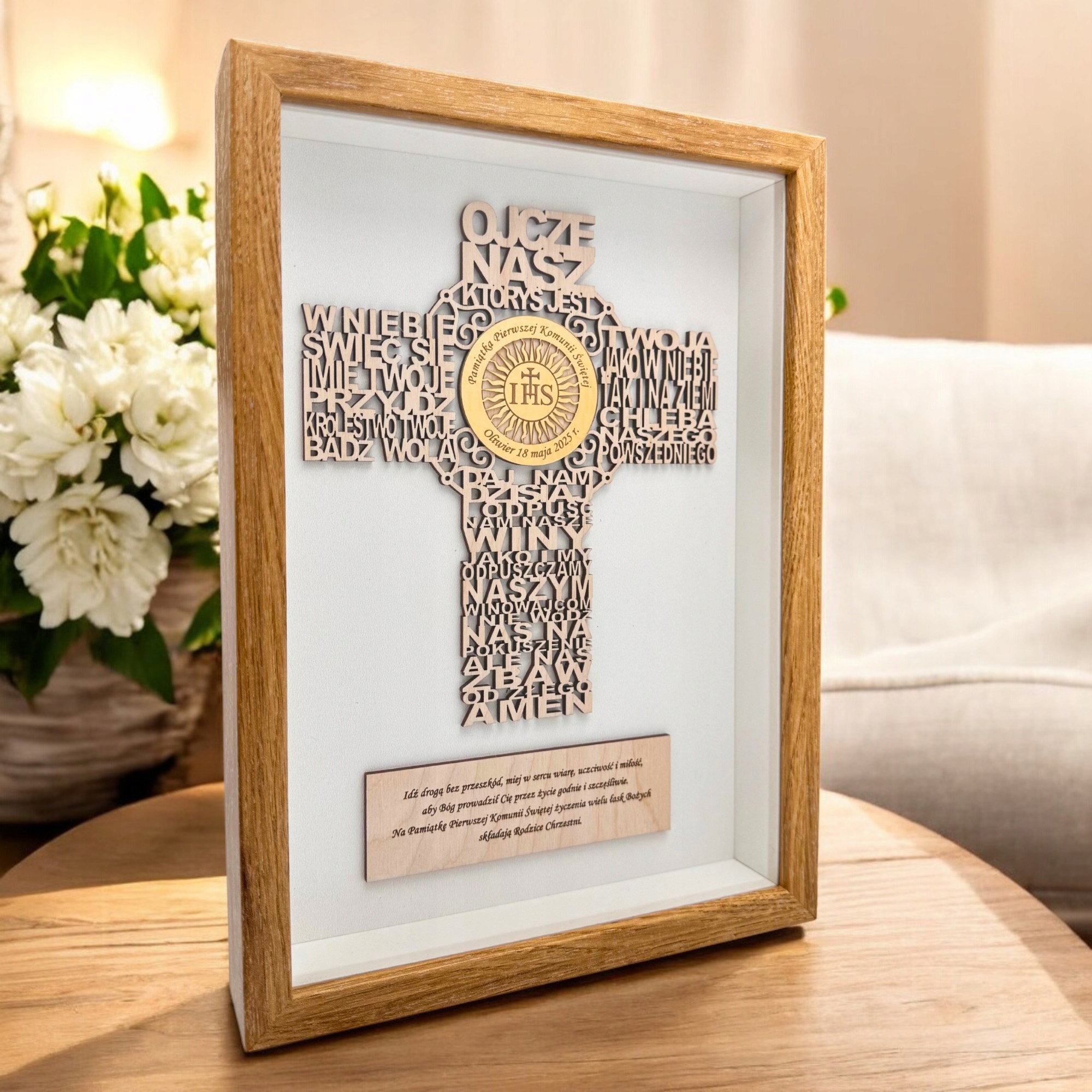 Эксклюзивная религиозная картина в элегантном, глубоком кадре - идеальный сувенир важных религиозных праздников. Молитва «Наш отец» был точно вырезан в форме креста, что дает всем уникальному персонажу.