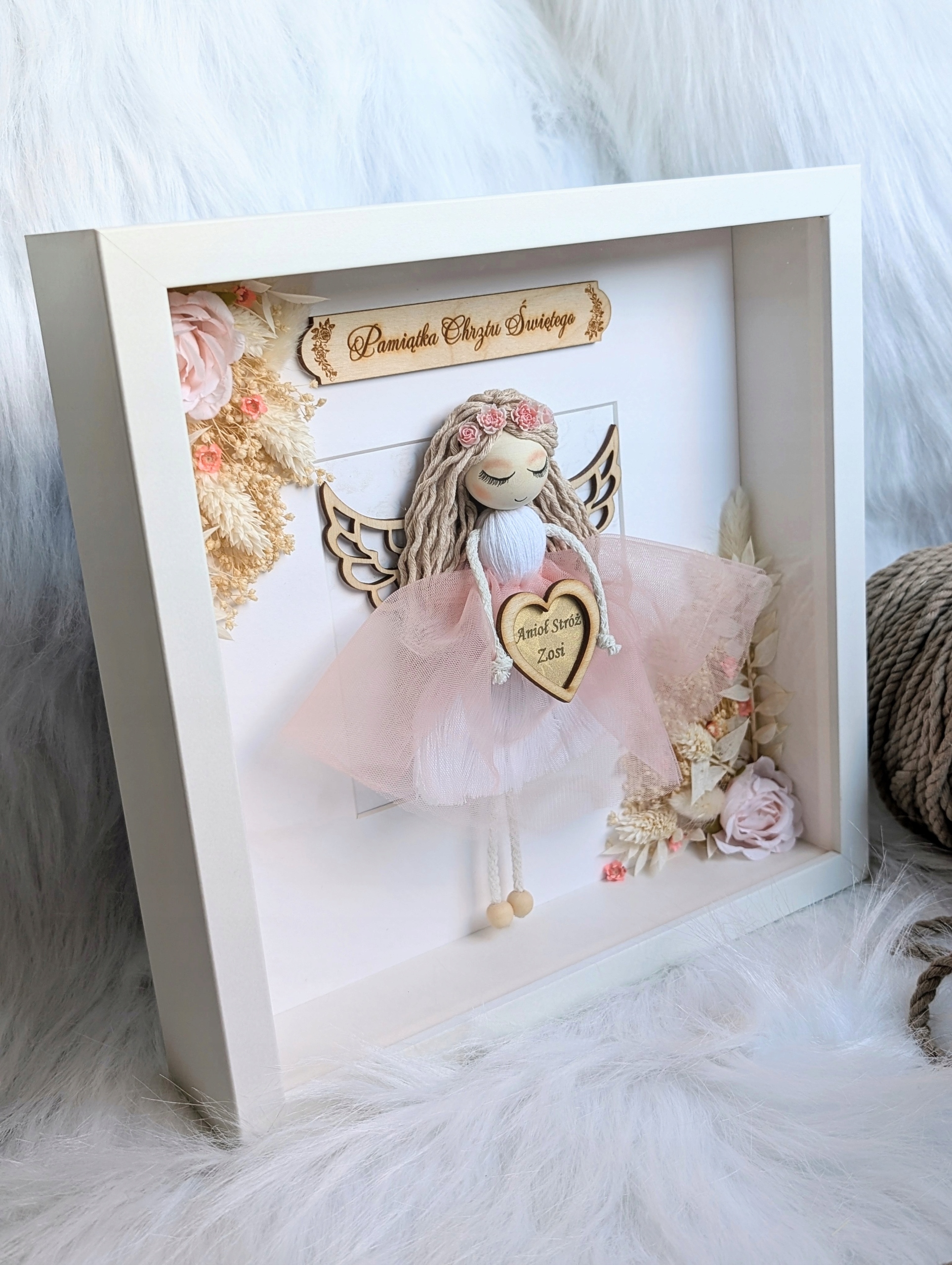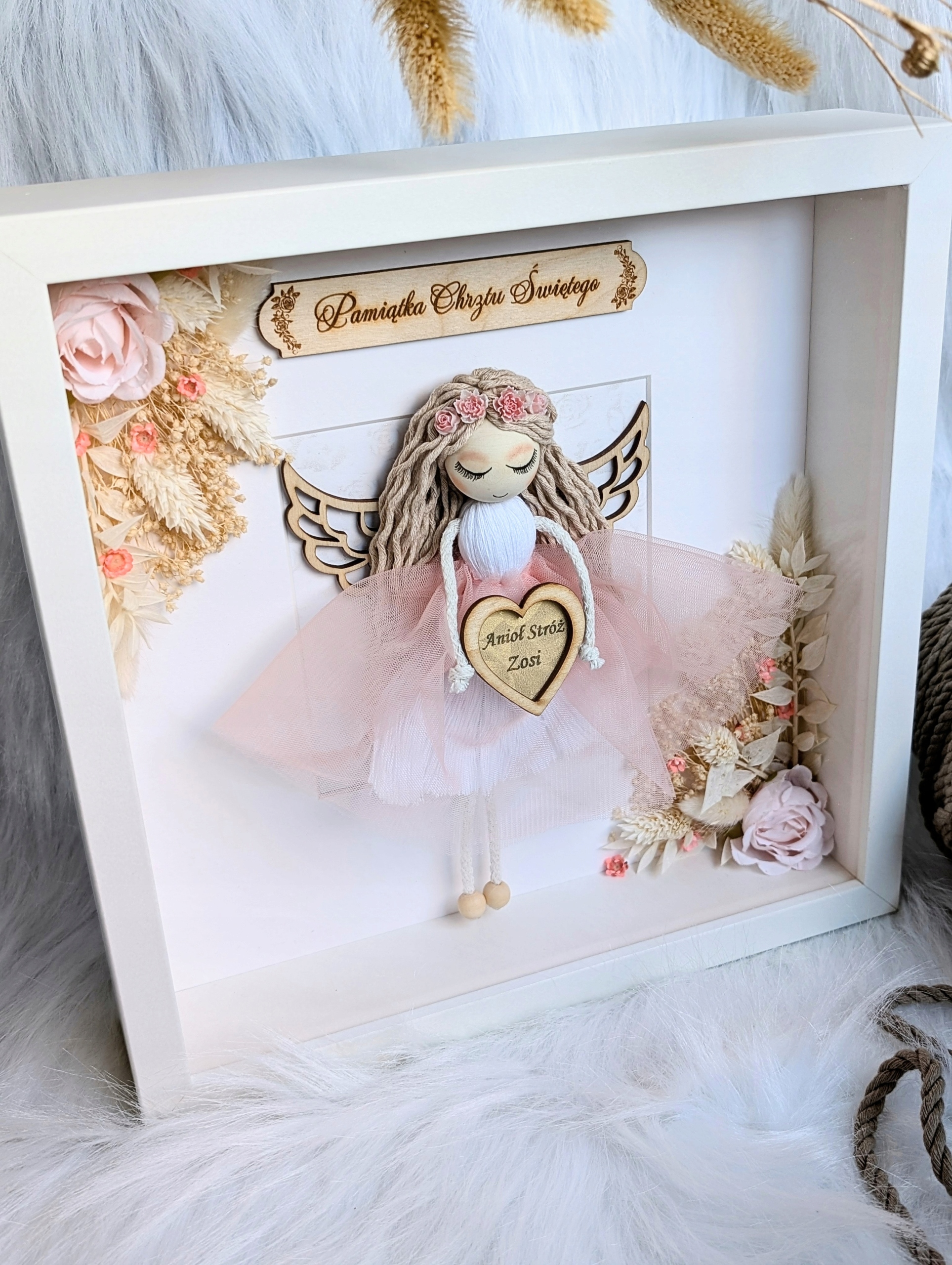 3D-рамка ручной работы с Ангелом-хранителем и композицией из засушенных растений и декоративных цветов.