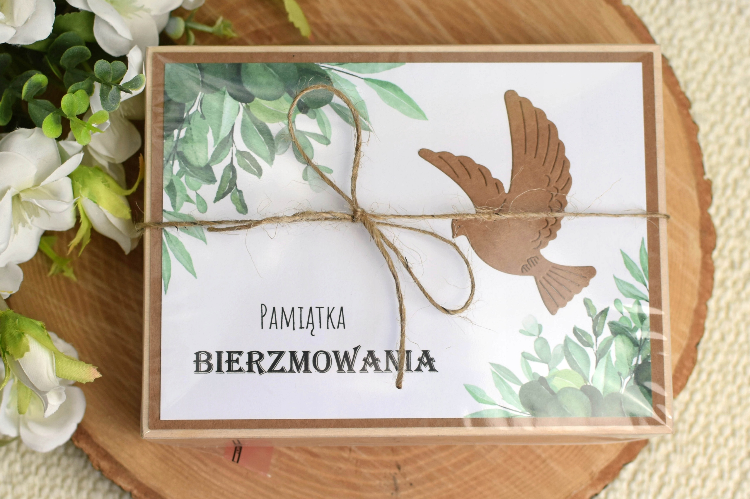 Коробочка упакована в целлофан, перевязана джутовой бечевкой.
