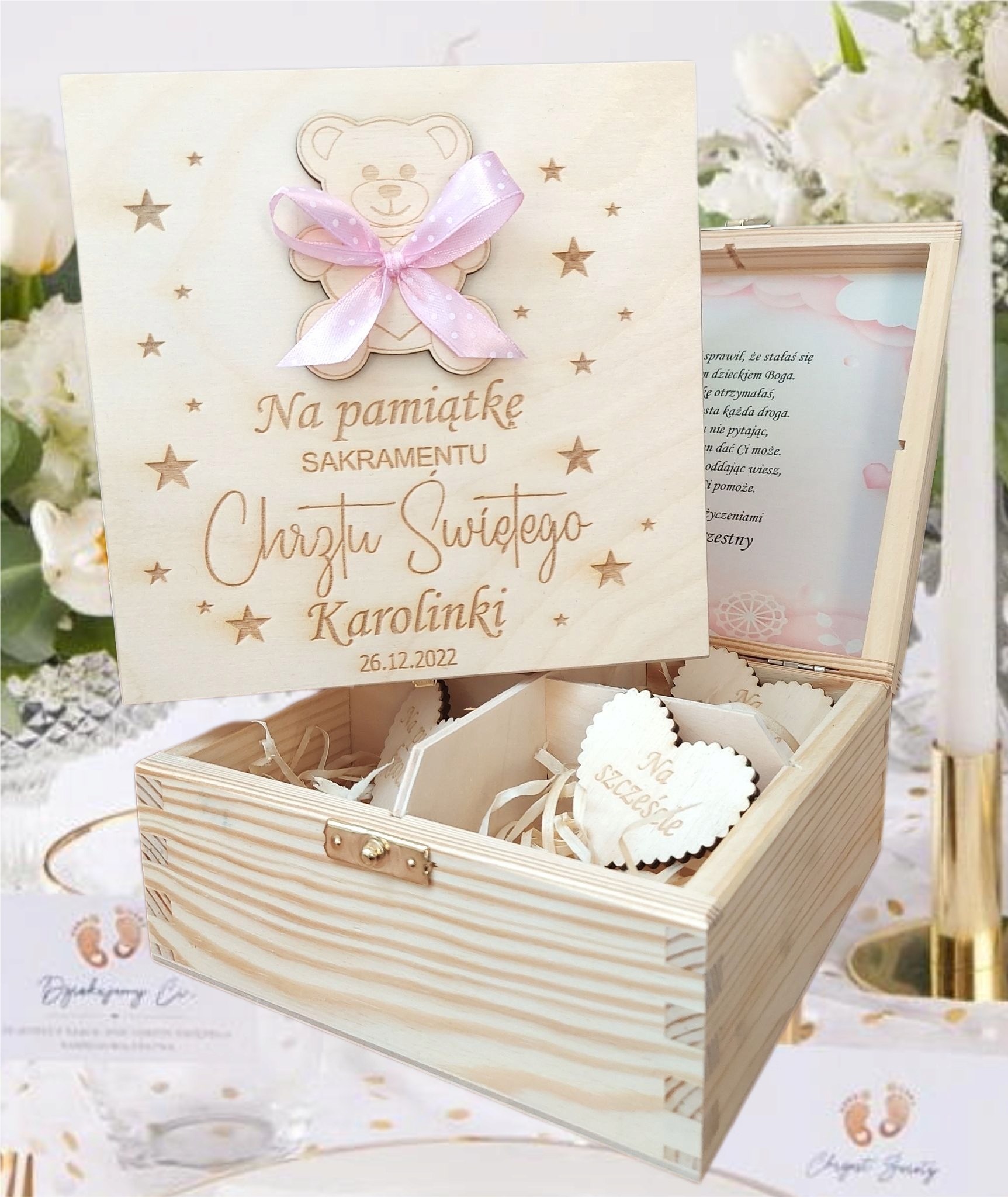 - гравировка спереди с деревянным мишкой и бантиком (розовый и синий)