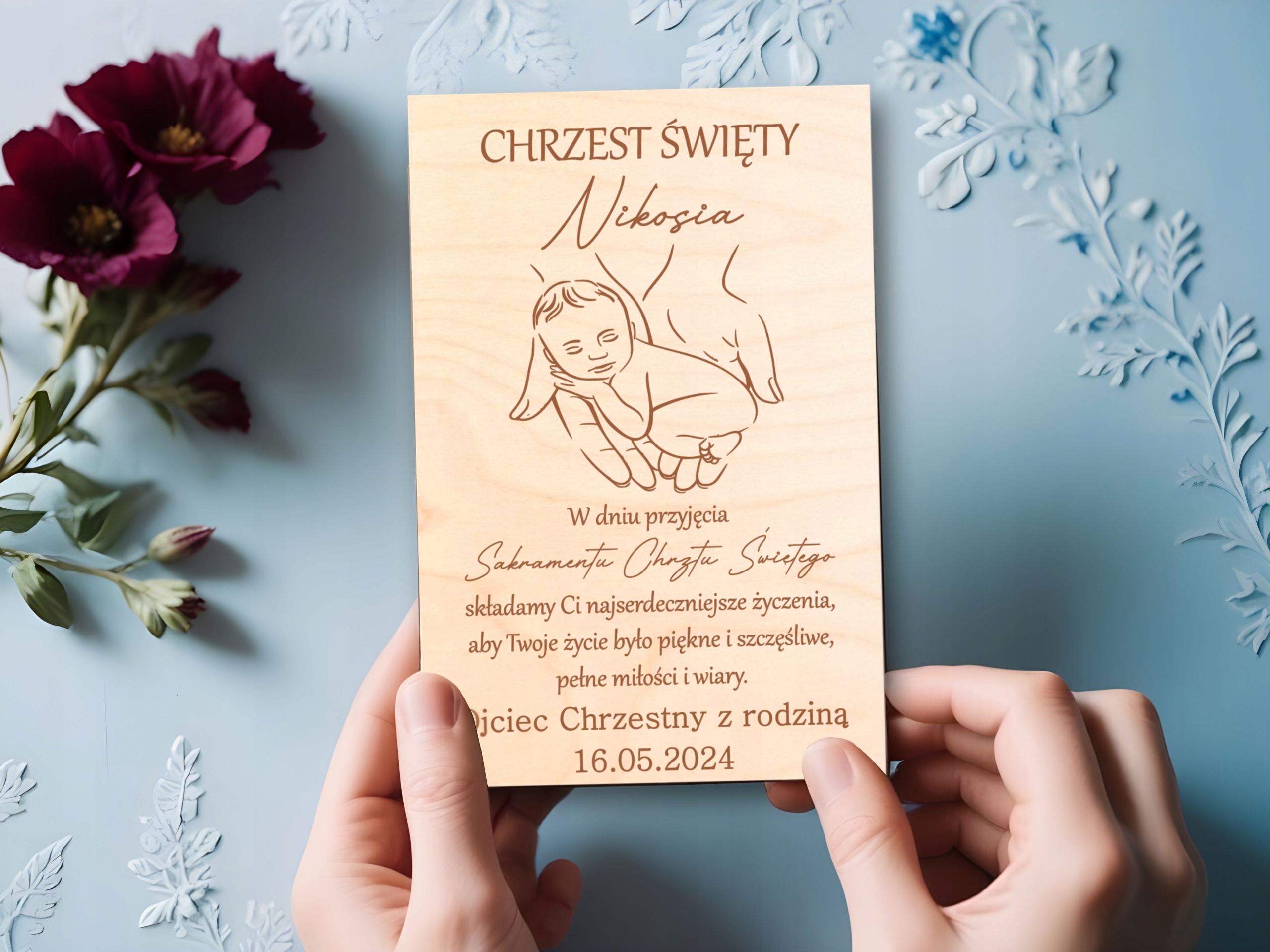 Предмет продажи – деревянная открытка (табличка) с лазерной гравировкой посвящения или стихотворения, с возможностью изменения дизайна. Наш сувенир на крестины изготовлен из фанеры толщиной 3мм лазерным методом. Он отшлифован вручную, на нем нет копоти или пятен подпалина. Эта деревянная открытка с гравировкой - отличная альтернатива обычным традиционным бумажным поздравительным открыткам! Удивите своих родных и друзей оригинальной идеей!