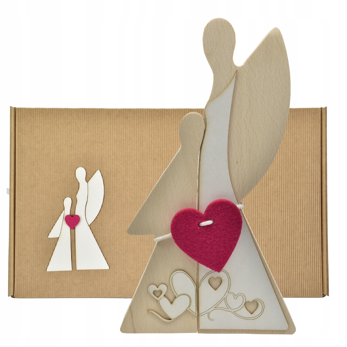 - Два Ангела, высота 22 см, толщина 2,5 см. Ангелочки изготовлены из древесины бука, перевязаны бечевкой с фетровой эмблемой в виде сердечка. Ангелочки дополнительно украшены эмблемой из пивной подставки.