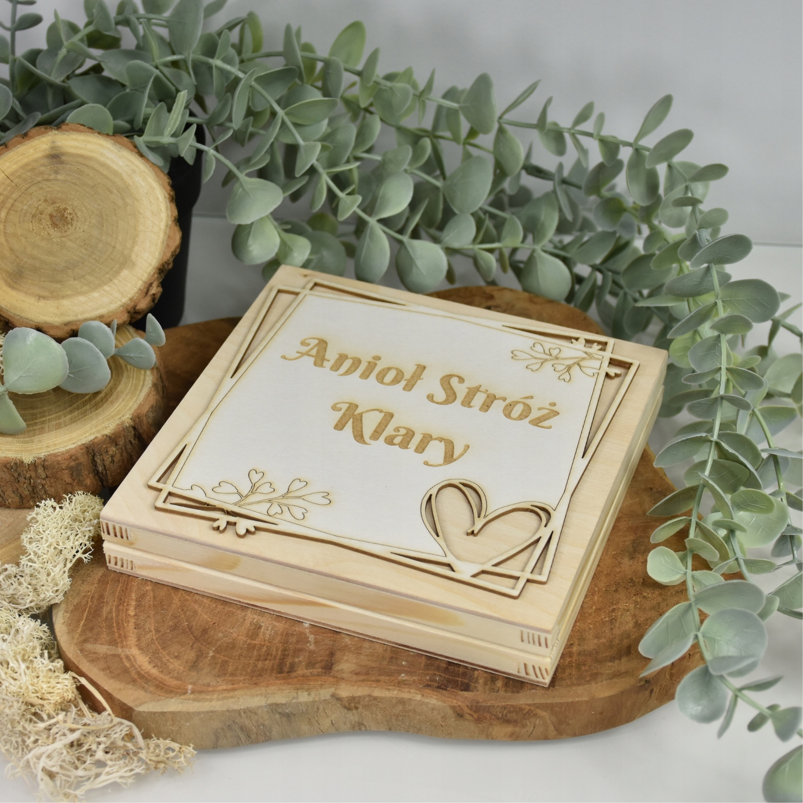 - Деревянная шкатулка размерами: 14,5 см х 14,5 см и высотой 2,5 см с выбранной эмблемой на крышке. крышка и персональные пожелания внутри коробки.