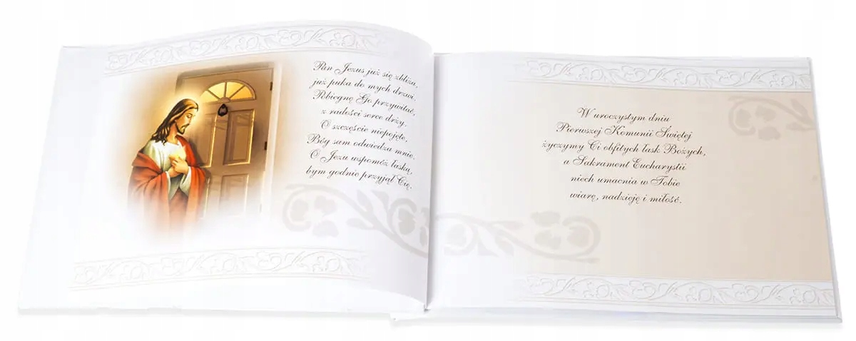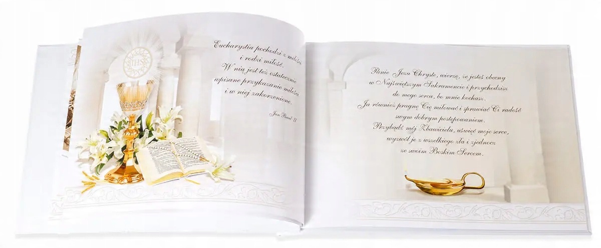 Памятный альбом в виде иллюстрированной книги, наполненный красочными страницами, содержащими богослужебные тексты, цитаты о Первом Причастии и молитвах. На обложке красивое изображение хозяина с розовыми цветами, а также надпись «Сувенир Первого Святого Причастия» и вдохновляющая цитата «Одно опытное Святое Причастие способно превратить нас в святых и совершенных». в альбом входит медальон с изображением Иисуса Милосердного. Этот альбом станет не только прекрасным украшением комнаты, но и прекрасным способом сохранить незабываемые моменты и ценные воспоминания о таком важном дне. Выбрав это изделие, вы непременно подарите радость своему ребенку, первое причастие которого навсегда останется в этом уникальном альбоме.