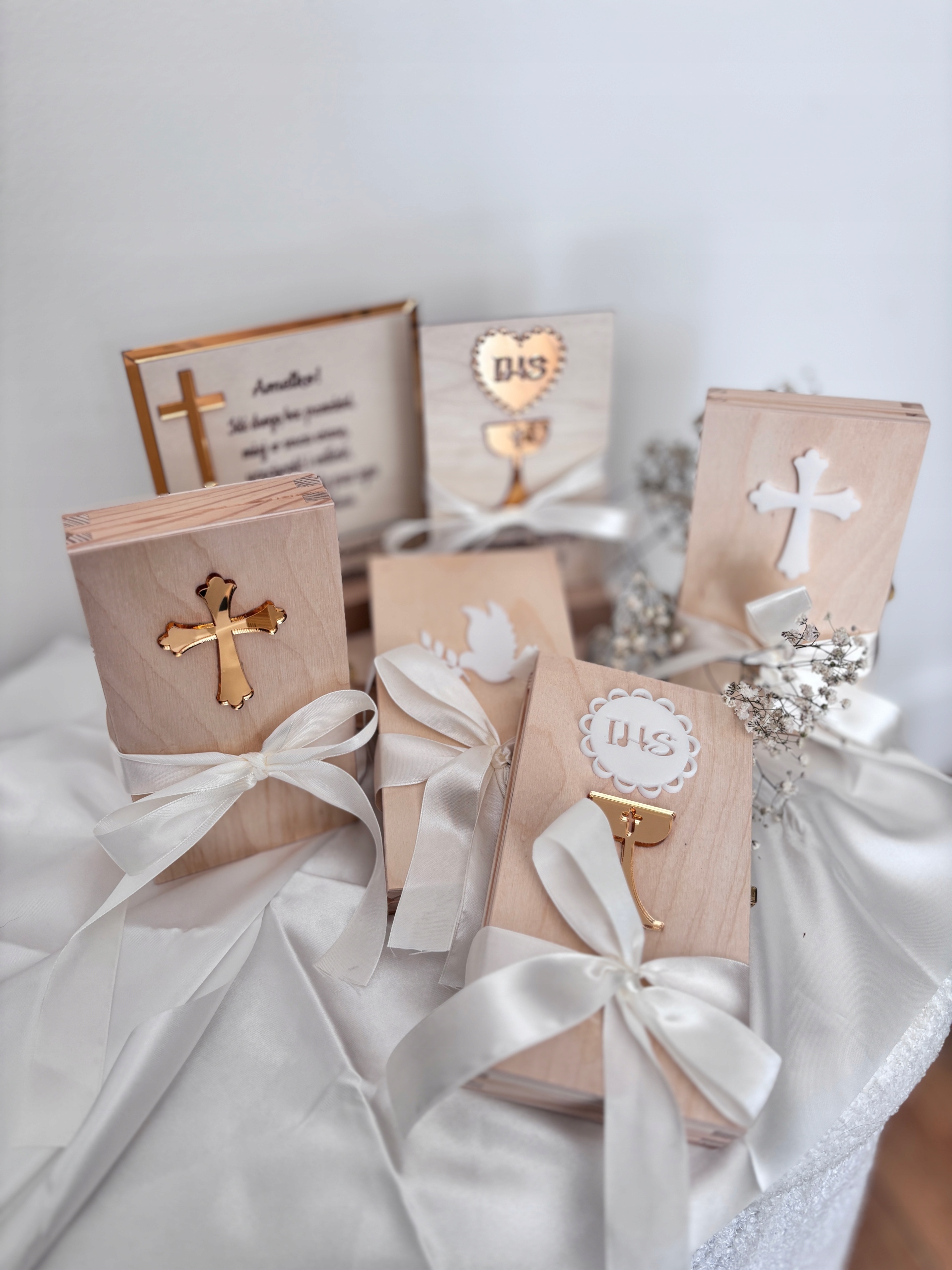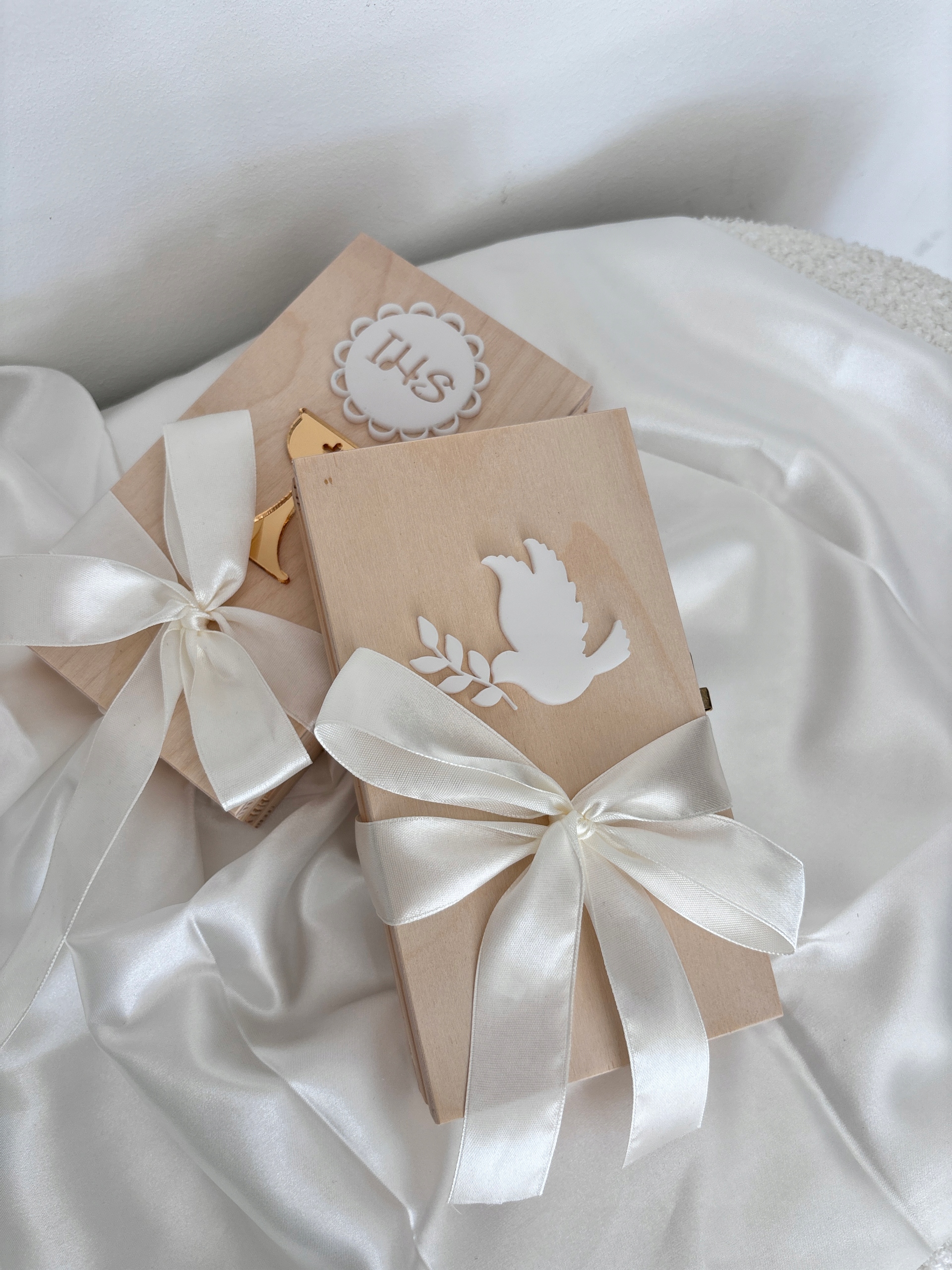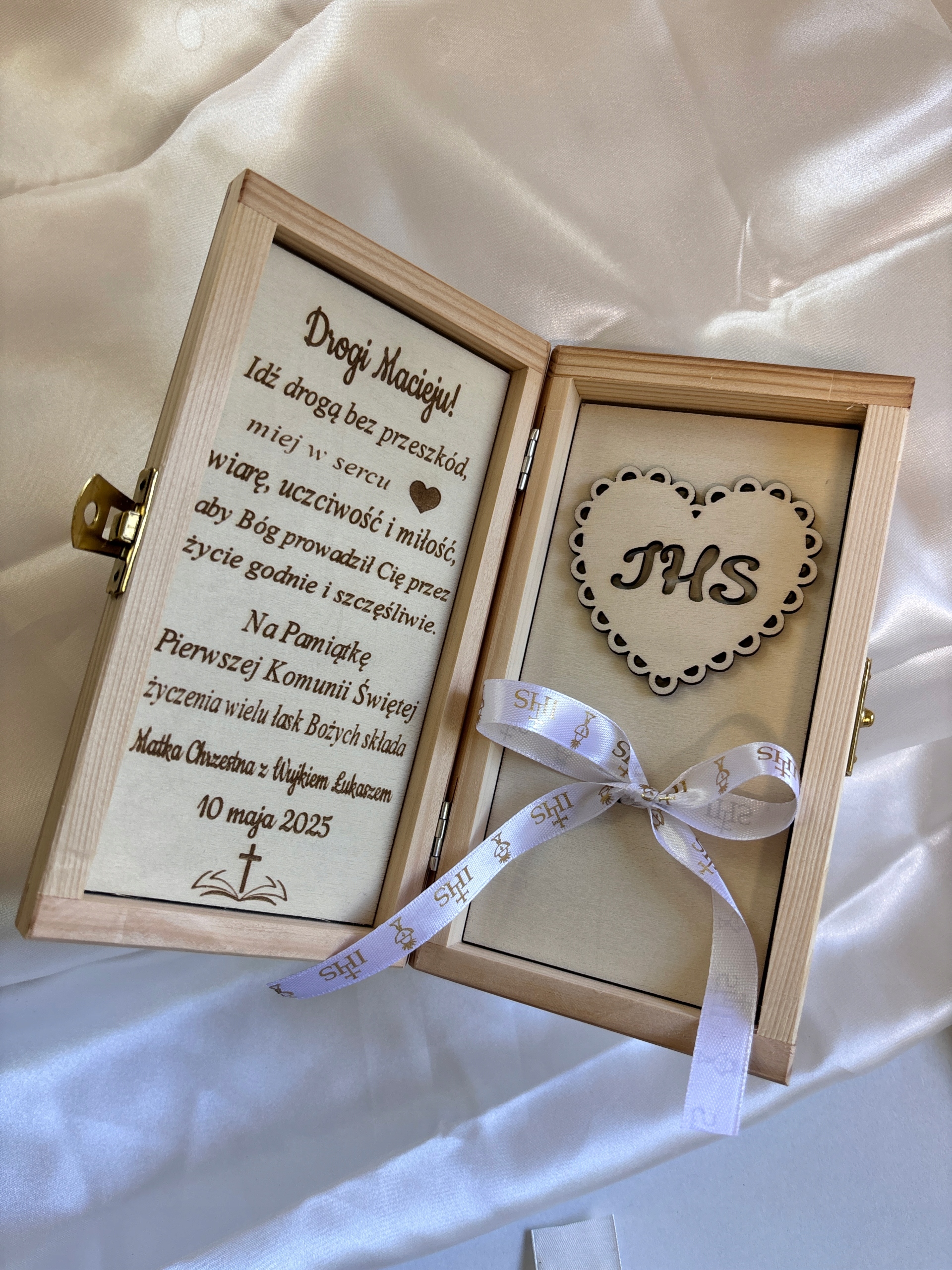 - Внутри коробки есть пожелания вместе с луком с надписью «Святое причастие», которое позволит прикреплять деньги, обернутые в бросок.