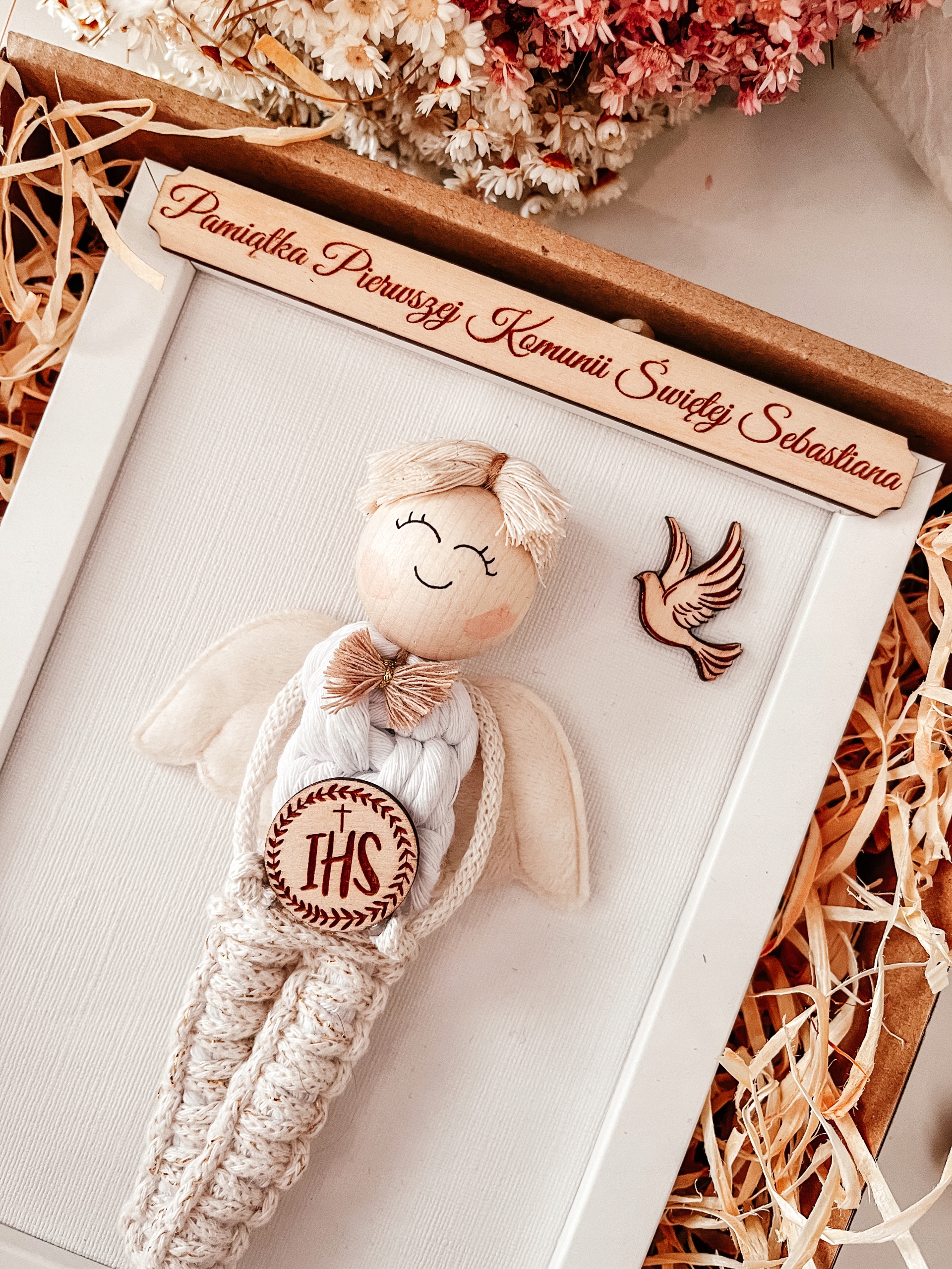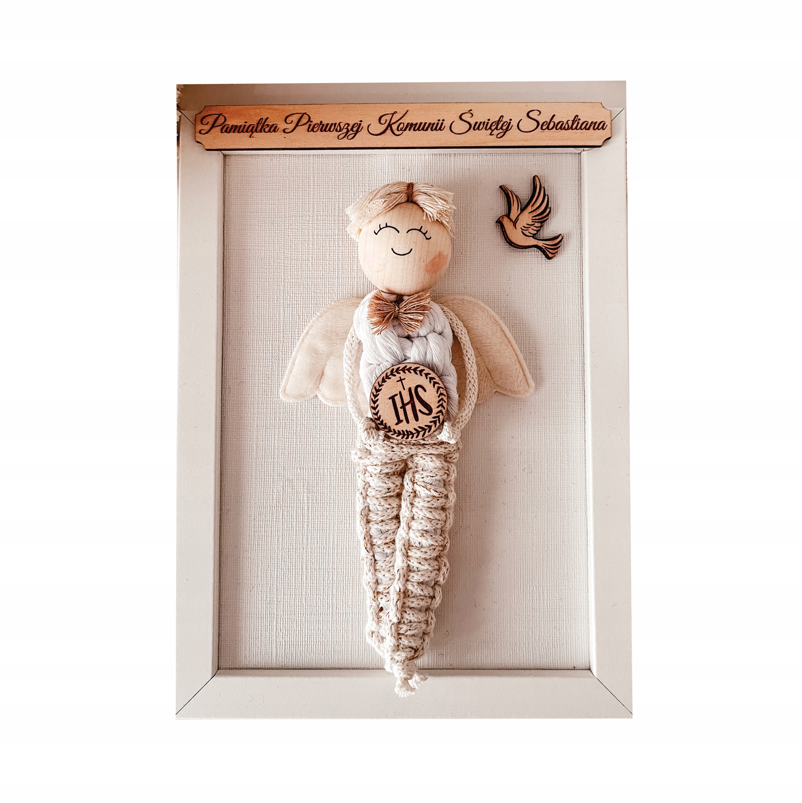Добавьте немного волшебства в комнату вашего ребенка благодаря очаровательному макраме Ангелу, заключенному в элегантную белую рамку. Ангел, сделанный из естественной струны, имеет тонкий наряд Бохо, который вводит тонкий, теплый акцент. Это идеальный дар для святого причастия - символ, полный духовного значения, который станет уникальным сувениром для ребенка для жизни. (рама), натуральная (одежда)