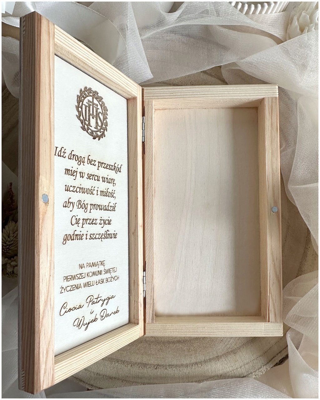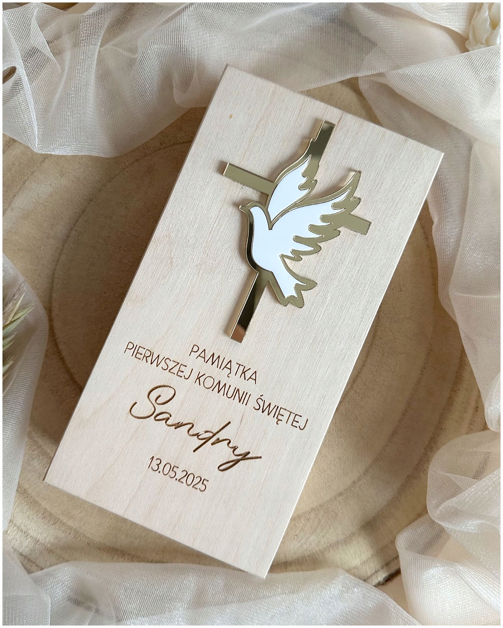 сувенир святого причастия в форме оригинального деревянного ящика - уникальная идея для подарка по случаю первого святого причастия . Продукт изготовлен из деревянной фанеры, золотого зеркального креста , в который чрезвычайно символический, белый голубь . Деньги