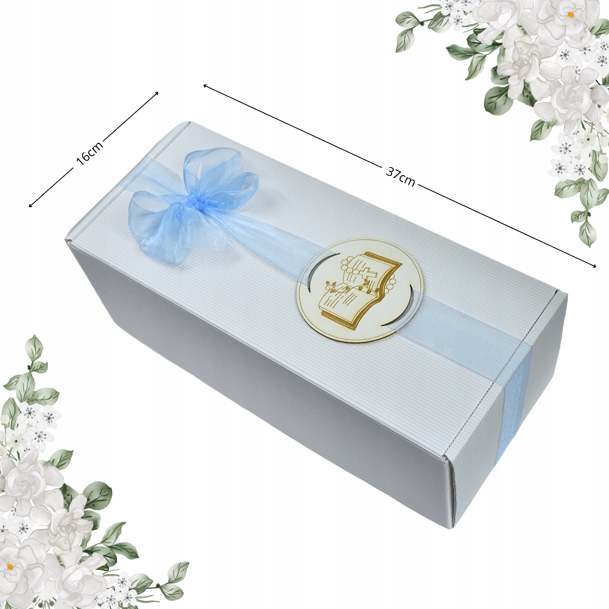 - коробка, белая карбированная эко -картонная коробка, заполненная деревянной шерстью, размеры: 37x162.5 Cm с эмблемой. Лента