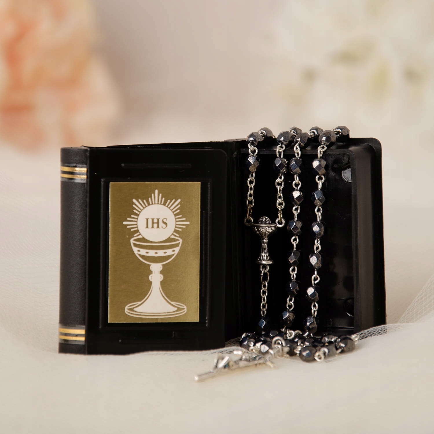 Красивые четки для причастия с хрустальными элементами на посеребренной цепочке.На конце изделия чаша с Гостией и Иисусом на кресте. Розарий является важнейшим элементом таинства Первого Причастия и после церемонии станет прекрасным сувениром на долгие годы.