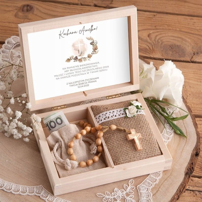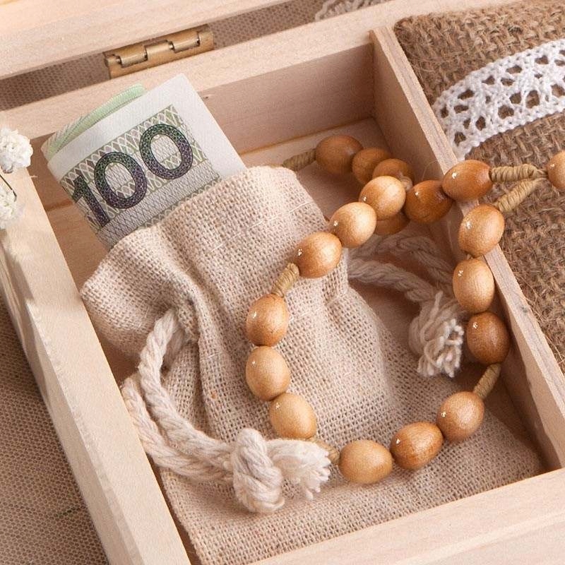 - коробка с двумя отделениями из светлого дерева; шкатулка имеет 2 отделения: в одном - мешочек из натурального льна, в который можно положить деньги, в другом - деревянная десятая часть четок, помещенная на мягкую губку, покрытую джутом с добавлением бумажного цветка и кружева< /ли>
