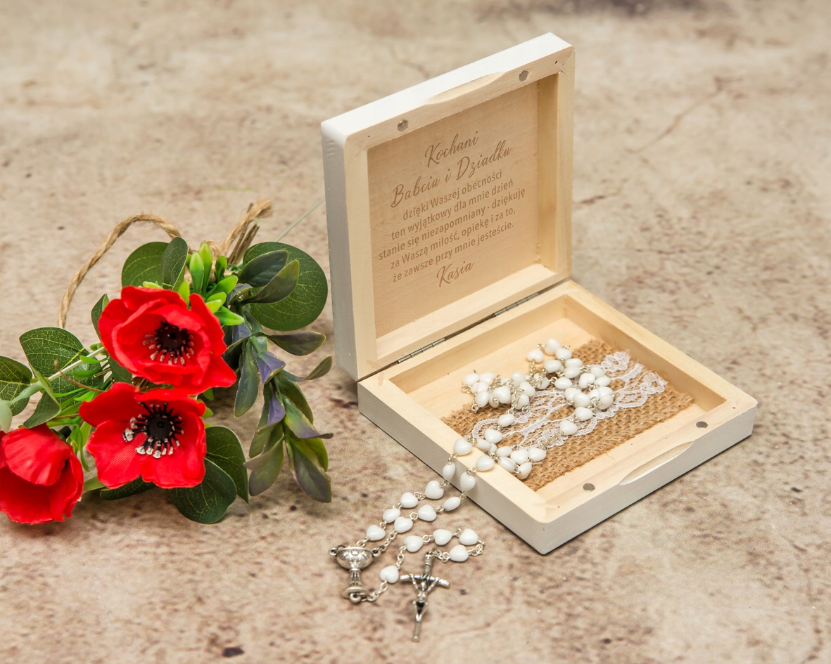 Белая деревянная шкатулка с красивыми четками (сердечками) на память о Святом Причастии. для ребенка или благодарность крестным, бабушкам и дедушкам.