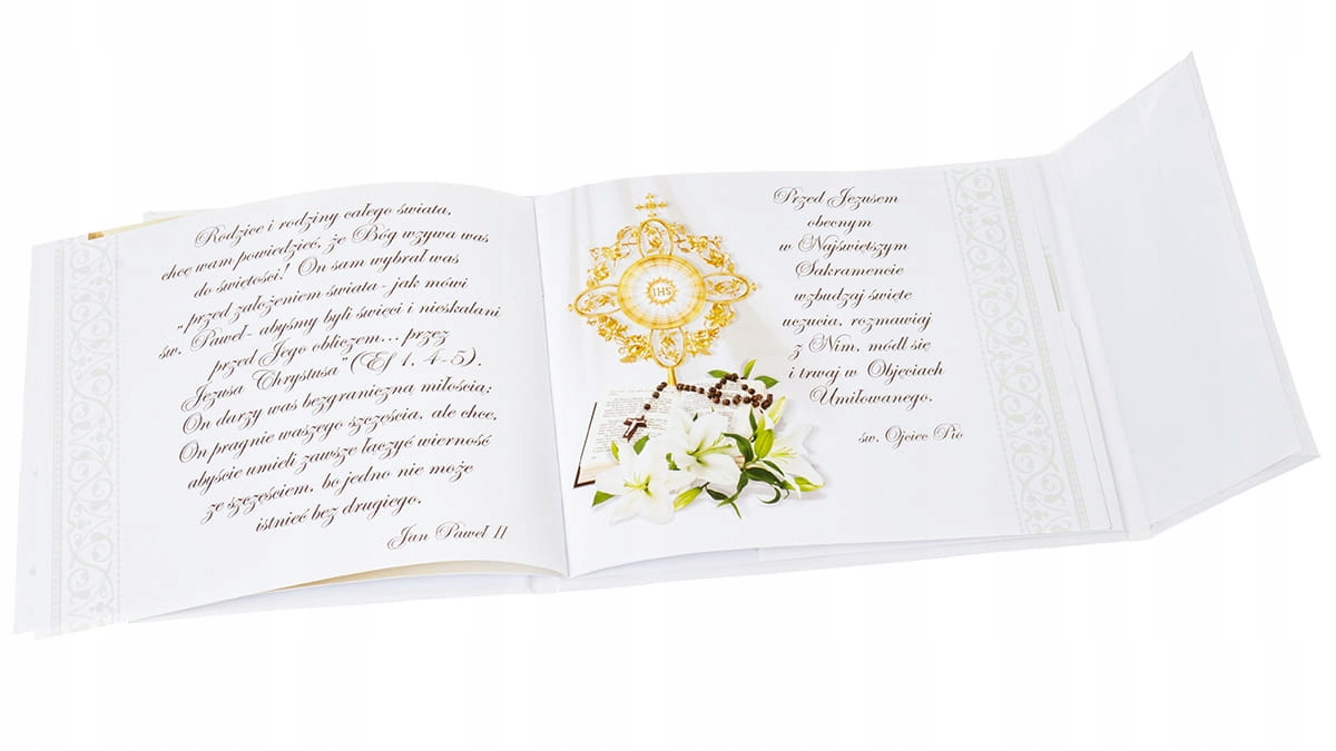 Сувенир Первого Причастияв виде небольшого иллюстрированного альбома. Книга насыщена красочными страницами с богослужебными текстами, цитатами о Первом Причастии, молитвами, одним местом для фотографии, пожеланиями и в конце закладкой для конверта. На сложенной обложке изображен мальчик в причастии и элементы, связанные с Таинством Причастия: Гостия и цветы синего цвета. На сувенире имеется надпись "Сувенир Первого Святого Причастия" и слова песни "Зерна соберем, сорняки выкинем, ведь поле созрело и пахнет свежим хлебом". ...Пусть наша земля станет жертвенником, а хлеб станет Причастием для жаждущих Тебя». Сувенир помещен в футляр, изящно декорированный блестками.