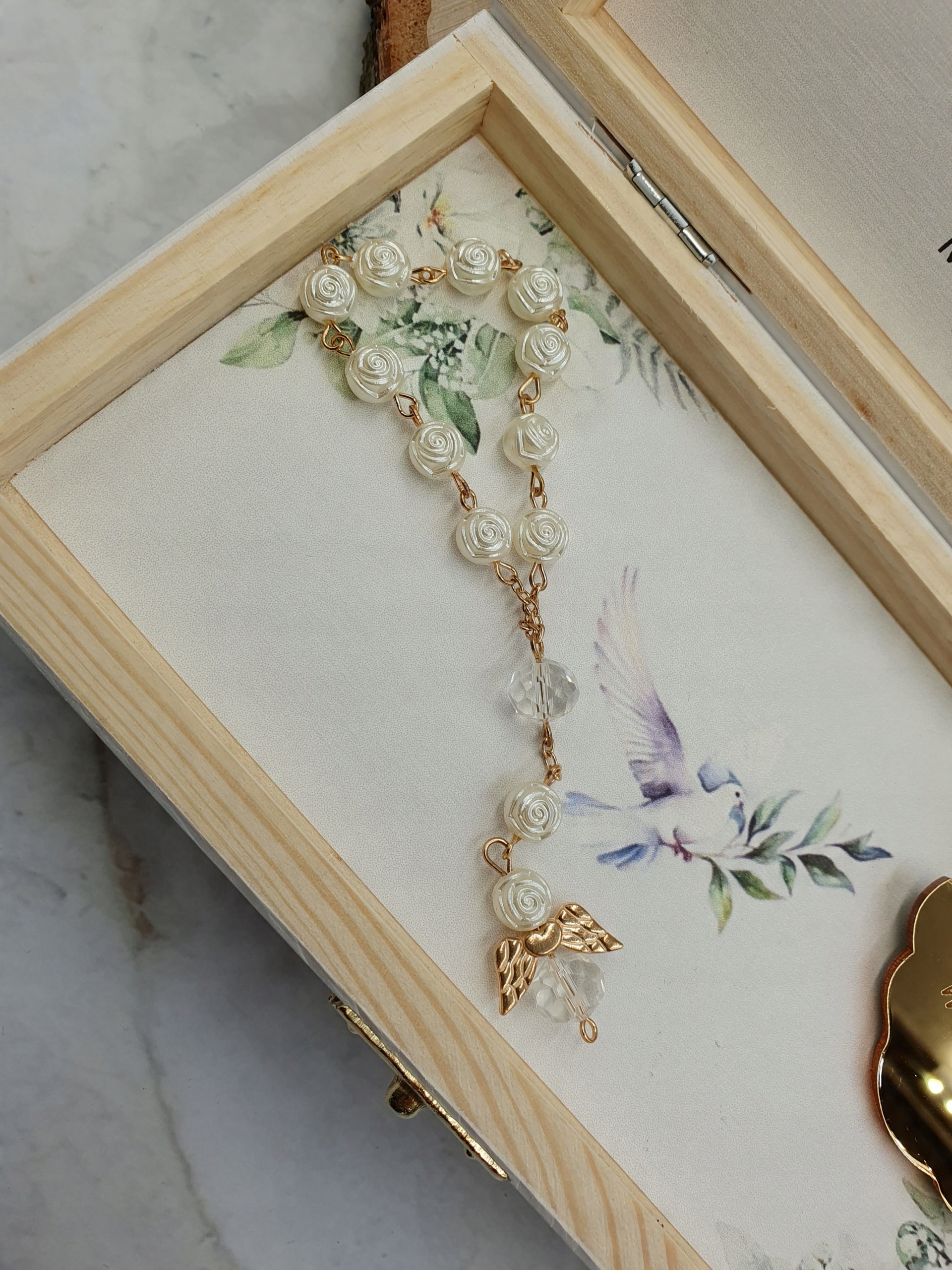 Сувенир святого причастия-белая коробка. Розарий и ангел