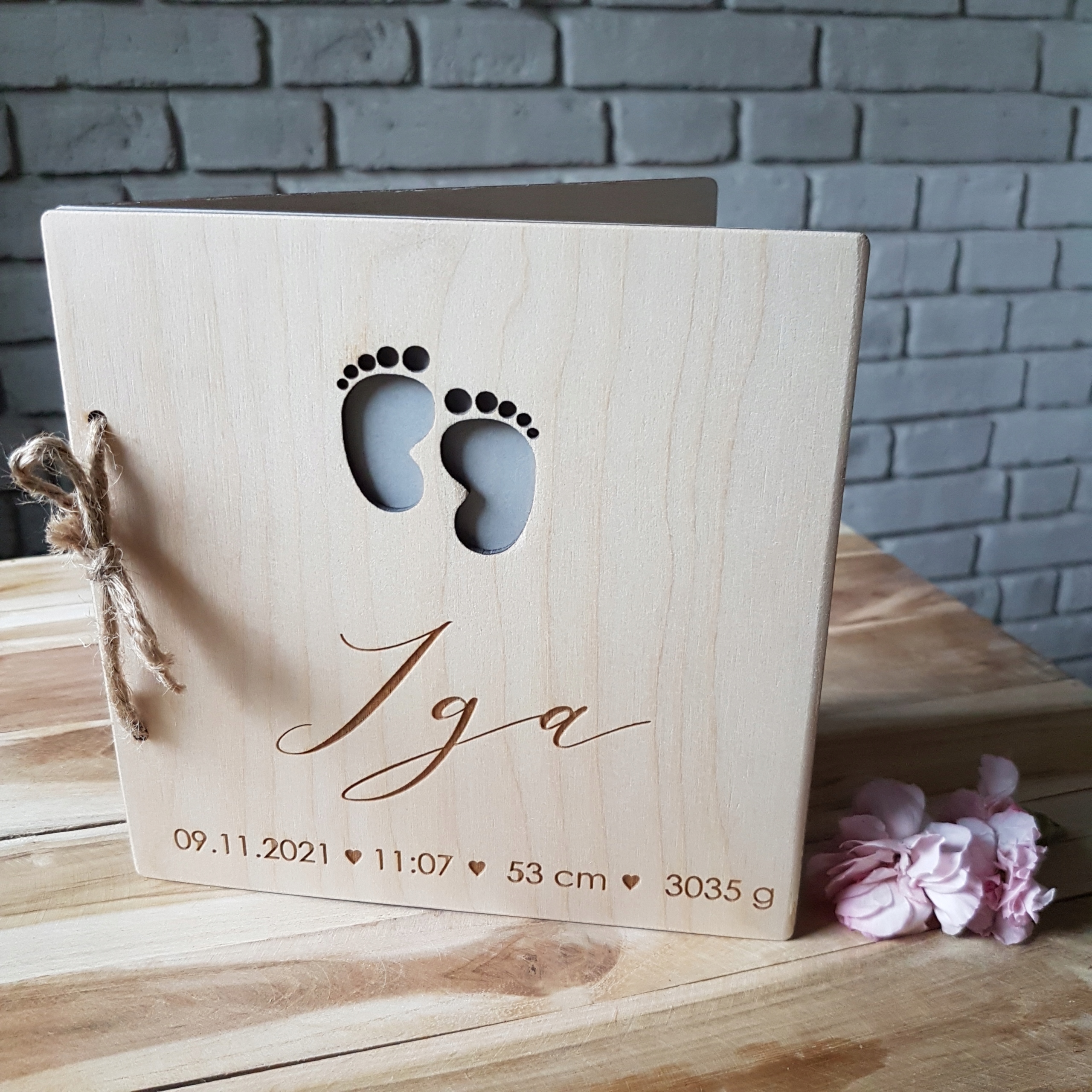 Рамка изготовлена из дерева и украшена гравировкой. Размеры одной детали: 17х17 см. Связан джутовой верёвкой.