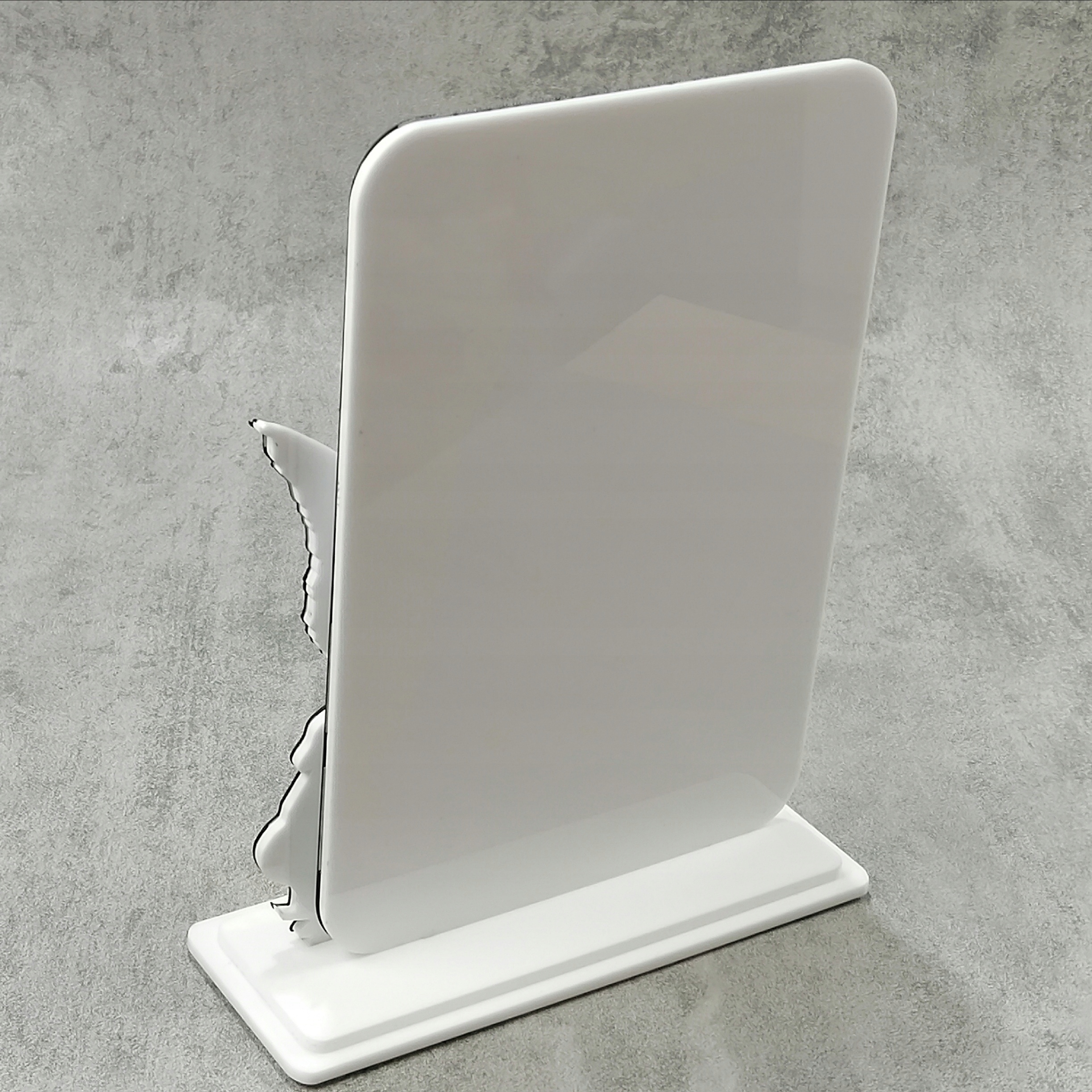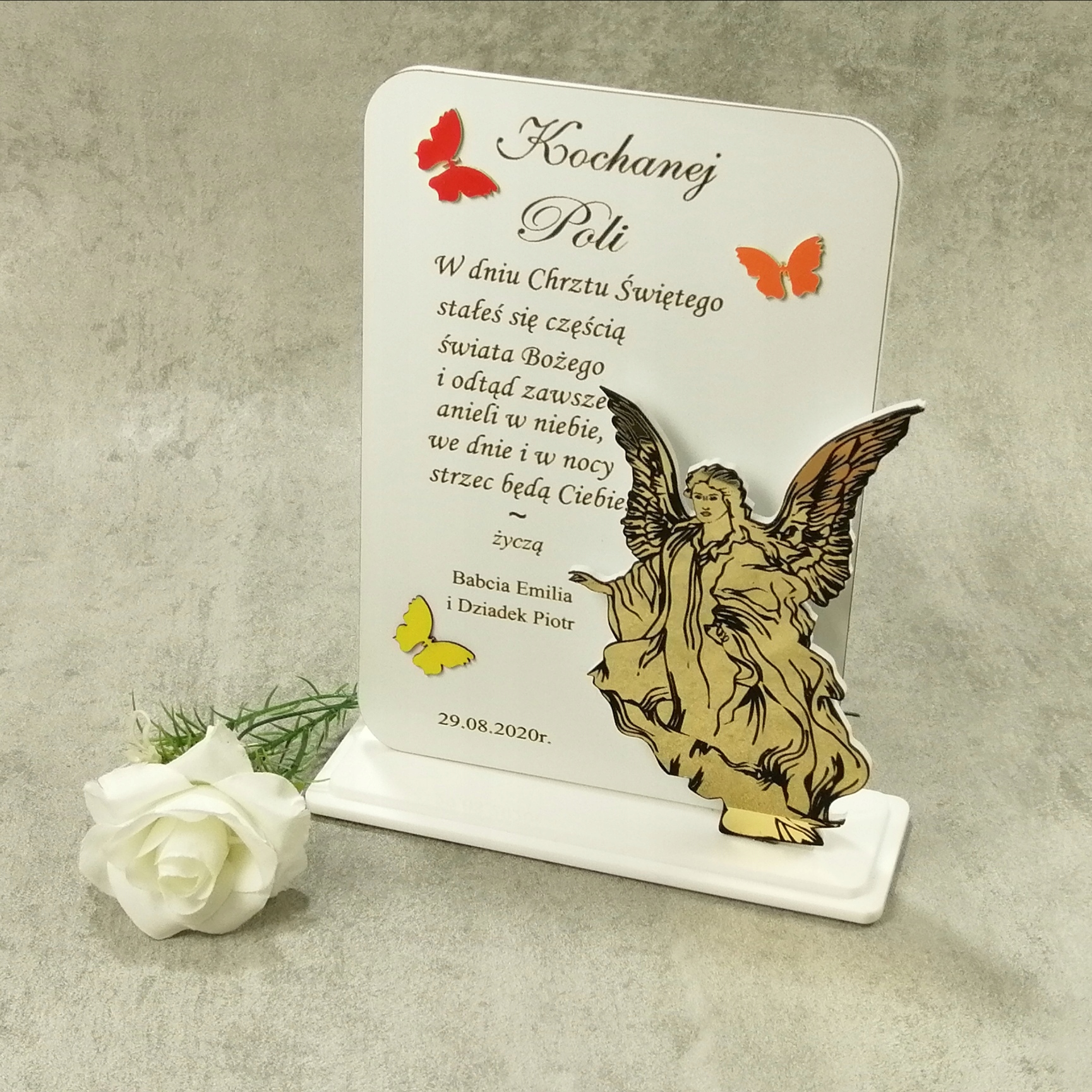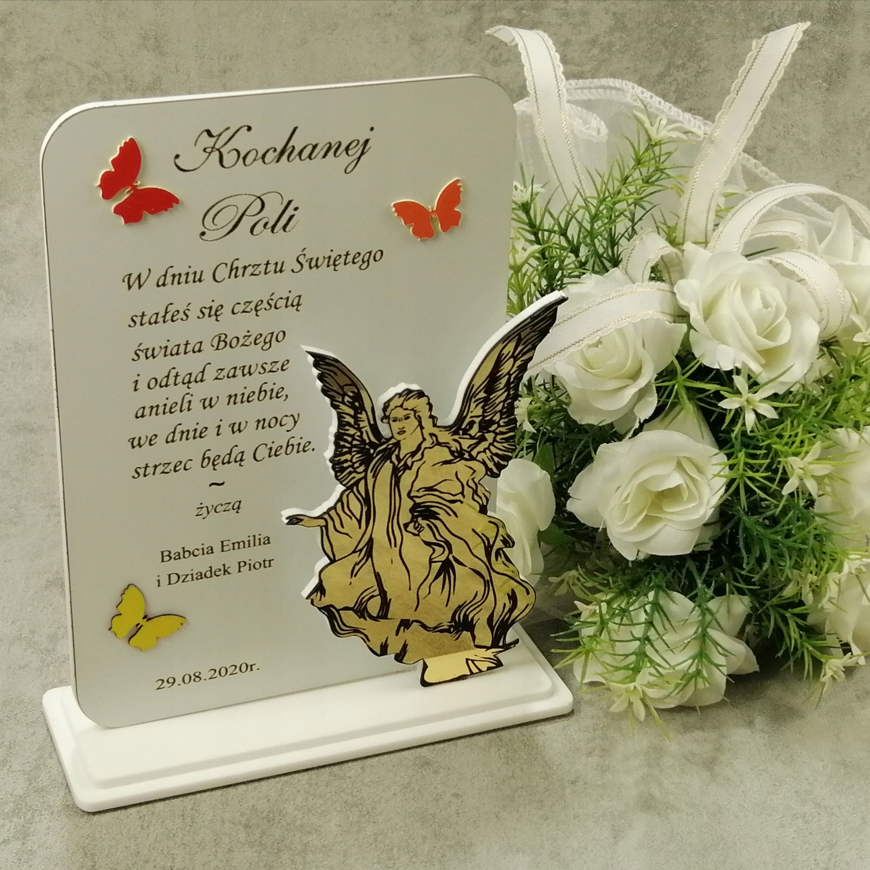 Статуэтка изготовлена из белого оргстекла. Лицевая часть покрыта белым ламинатом. На этом ламинате мы выгравировали пожелания малышу. Сувенир украшен золотым ангелом, вырезанным и выгравированным из зеркального ламината, и тремя бабочками желтого, красного и оранжевого цветов. Ангел расположен в передней части статуэтки, такое положение дает трехмерный эффект.