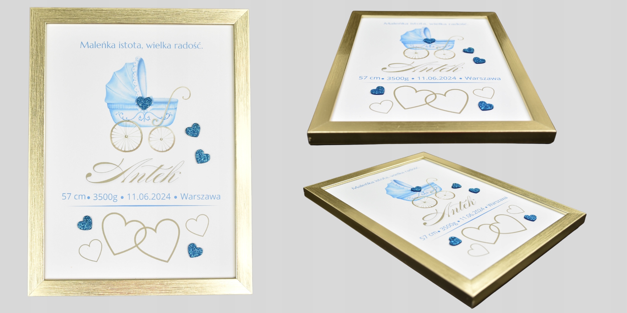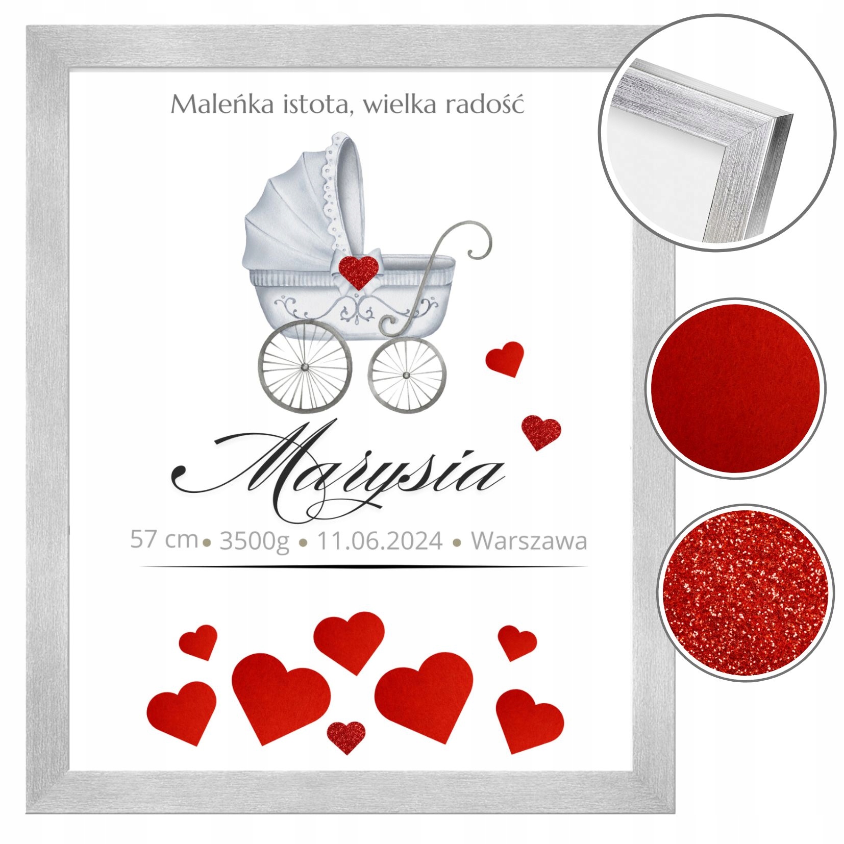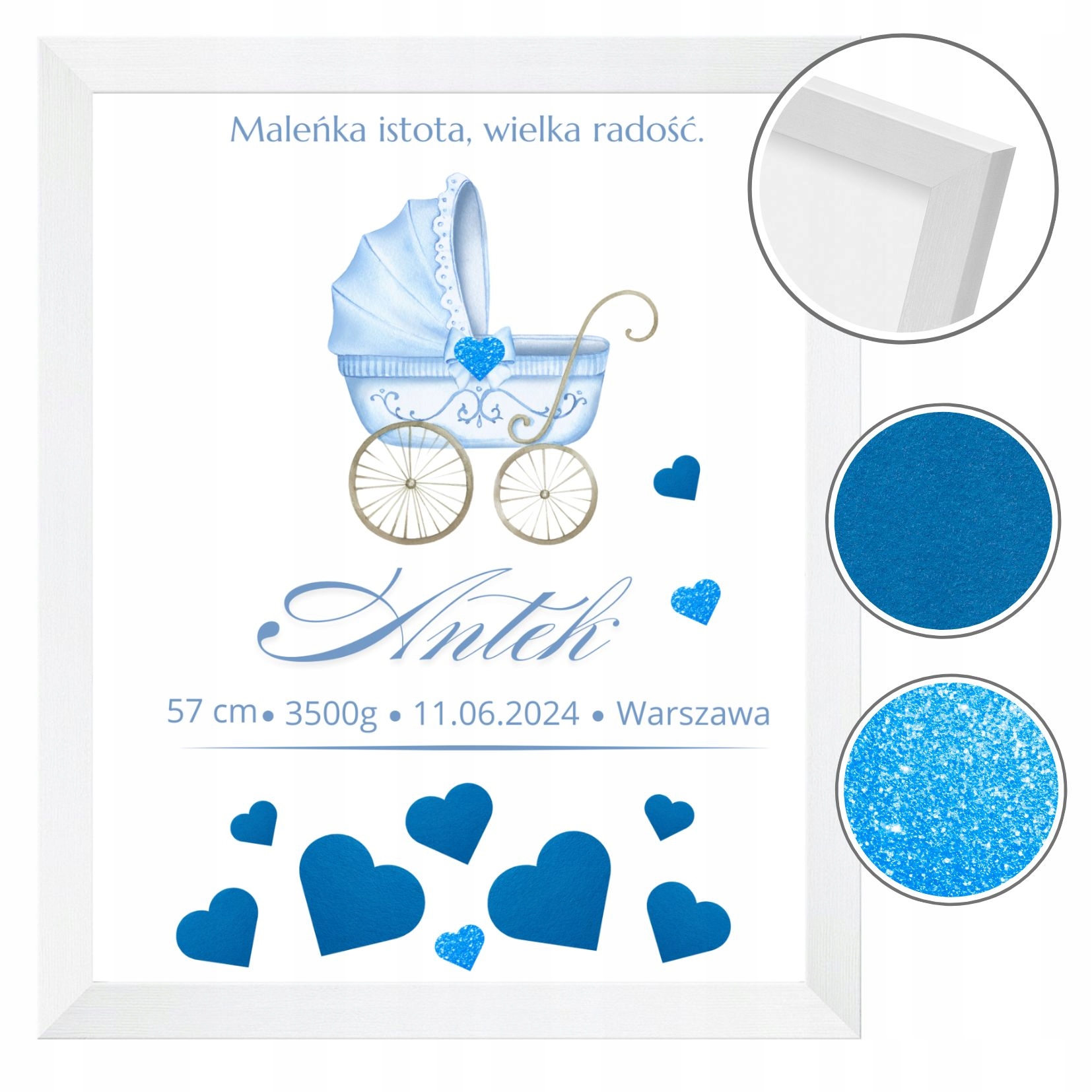 Именное 3D-свидетельство о рождении ребенка с аксессуарами из фетра и блестящим ковриком, в рамке размером 20х26 см.