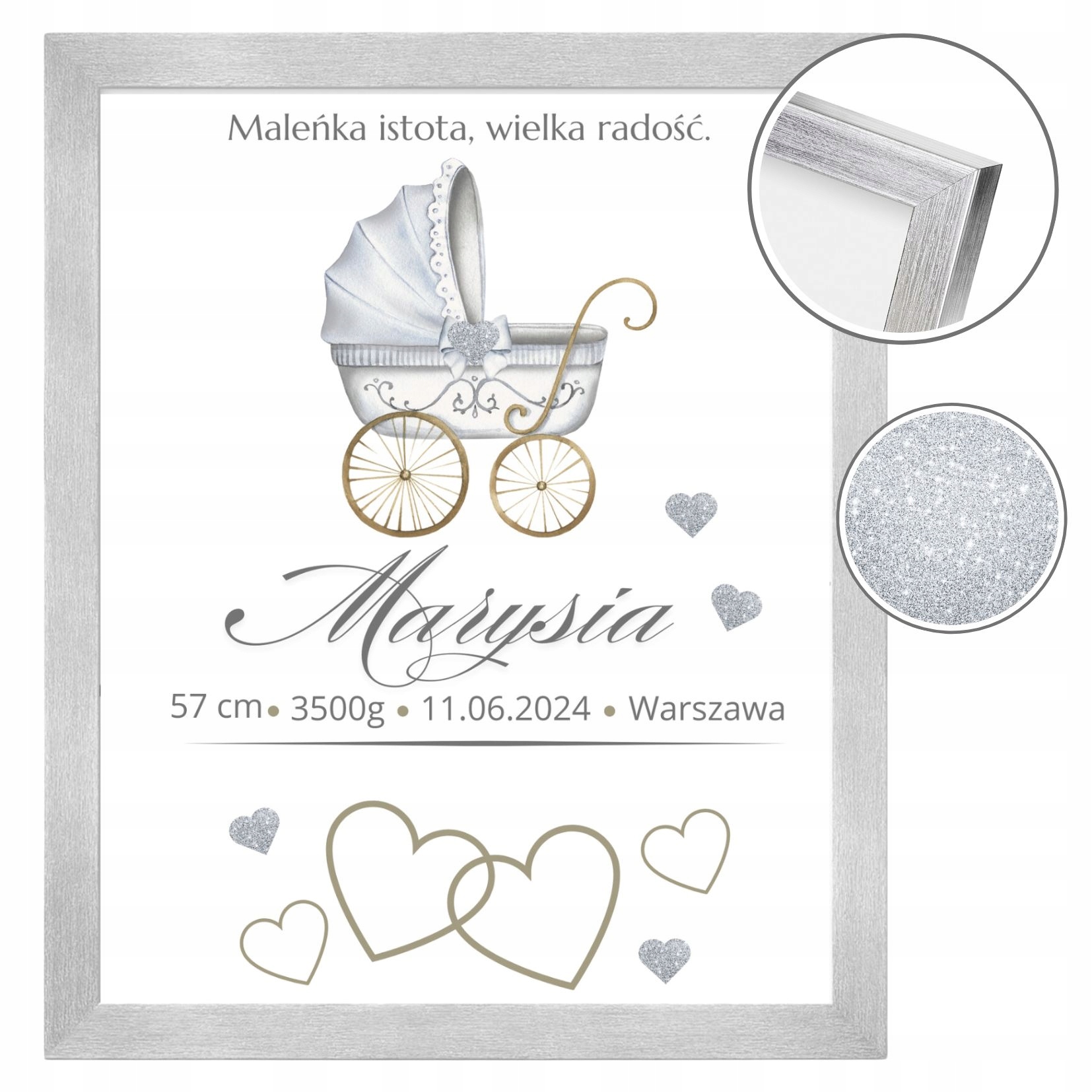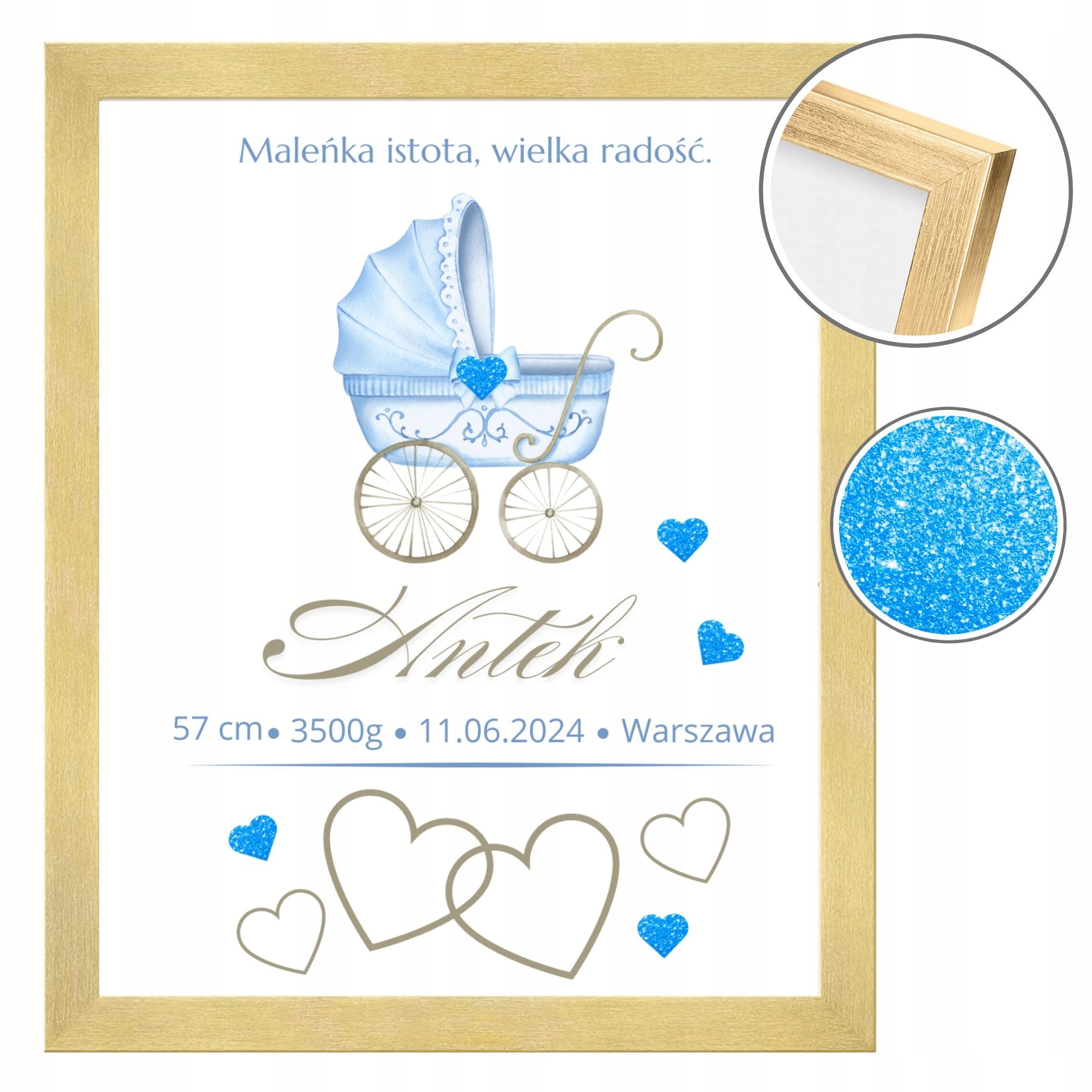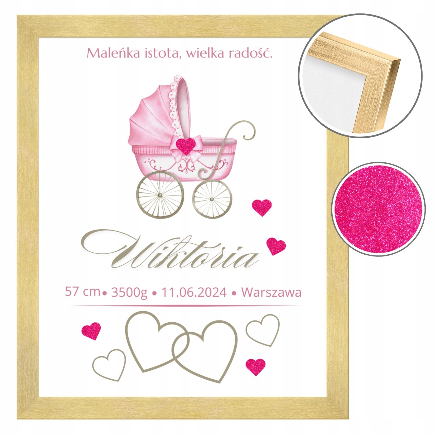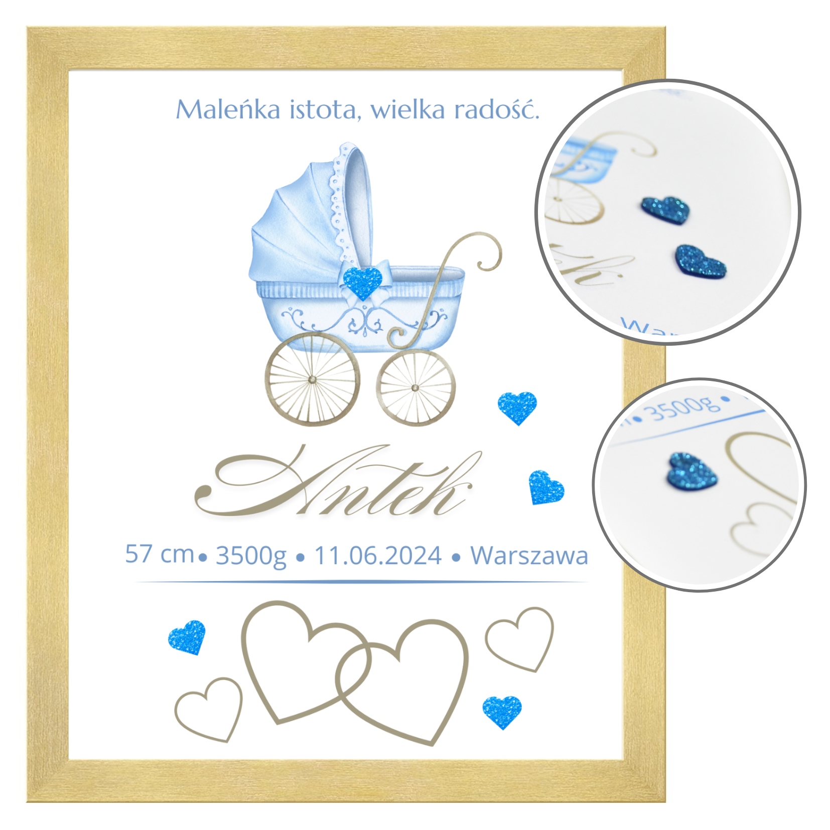 Именное 3D-свидетельство о рождении ребенка с аксессуарами из фетра и блестящим ковриком, в рамке размером 20х26 см.