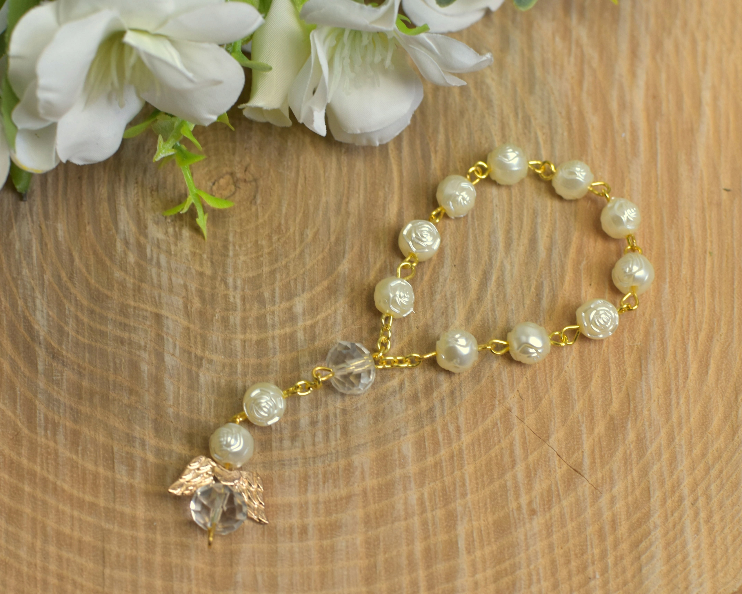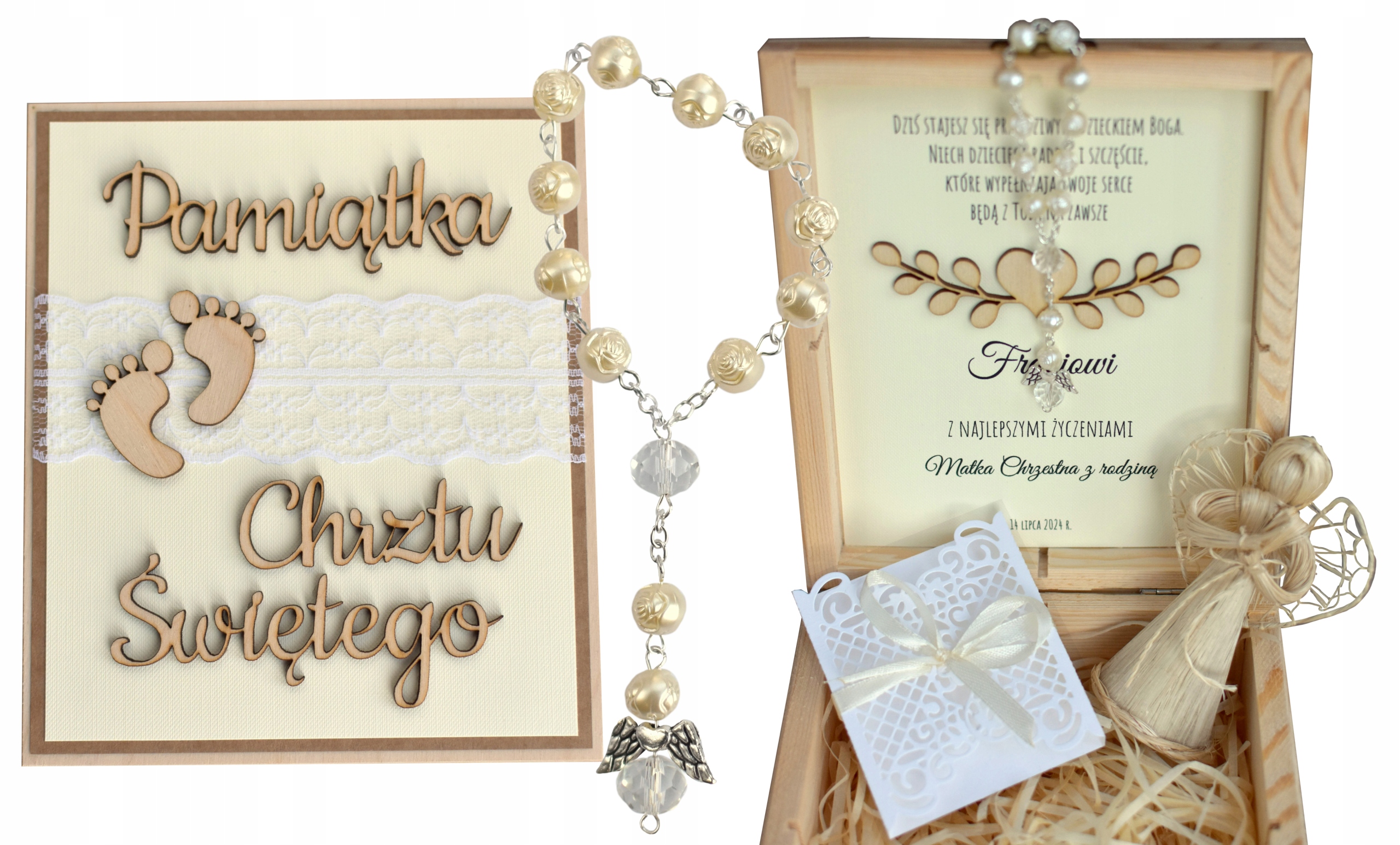 На верхней части ящика деревянная надпись и фанерные ножки, а внутри рыхлый ажурный футляр для денег, десятая часть четок с ангелочек в сумке из органзы, а также ангелочек.