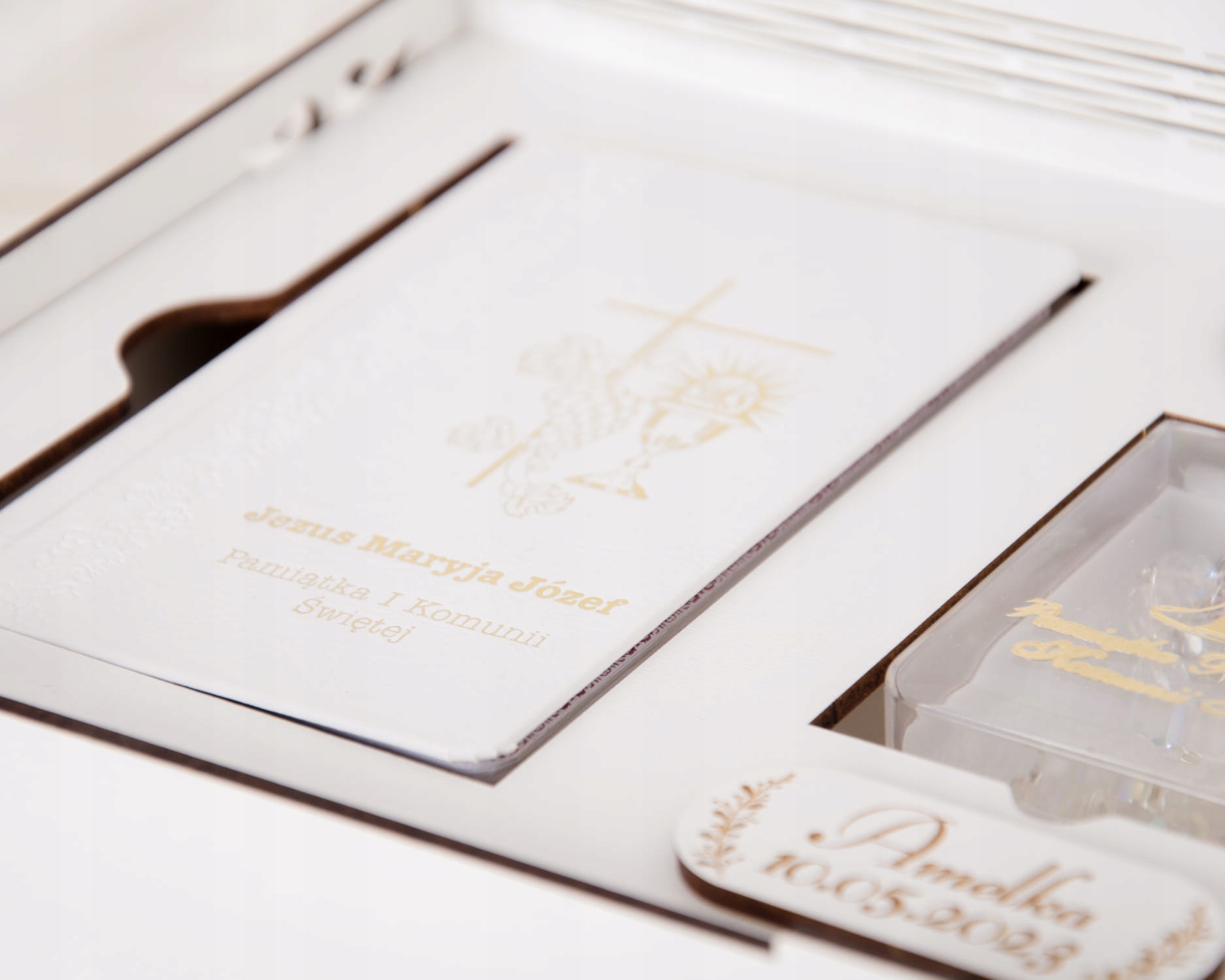 Внутри персонализация с именем и датой Первого Причастия.