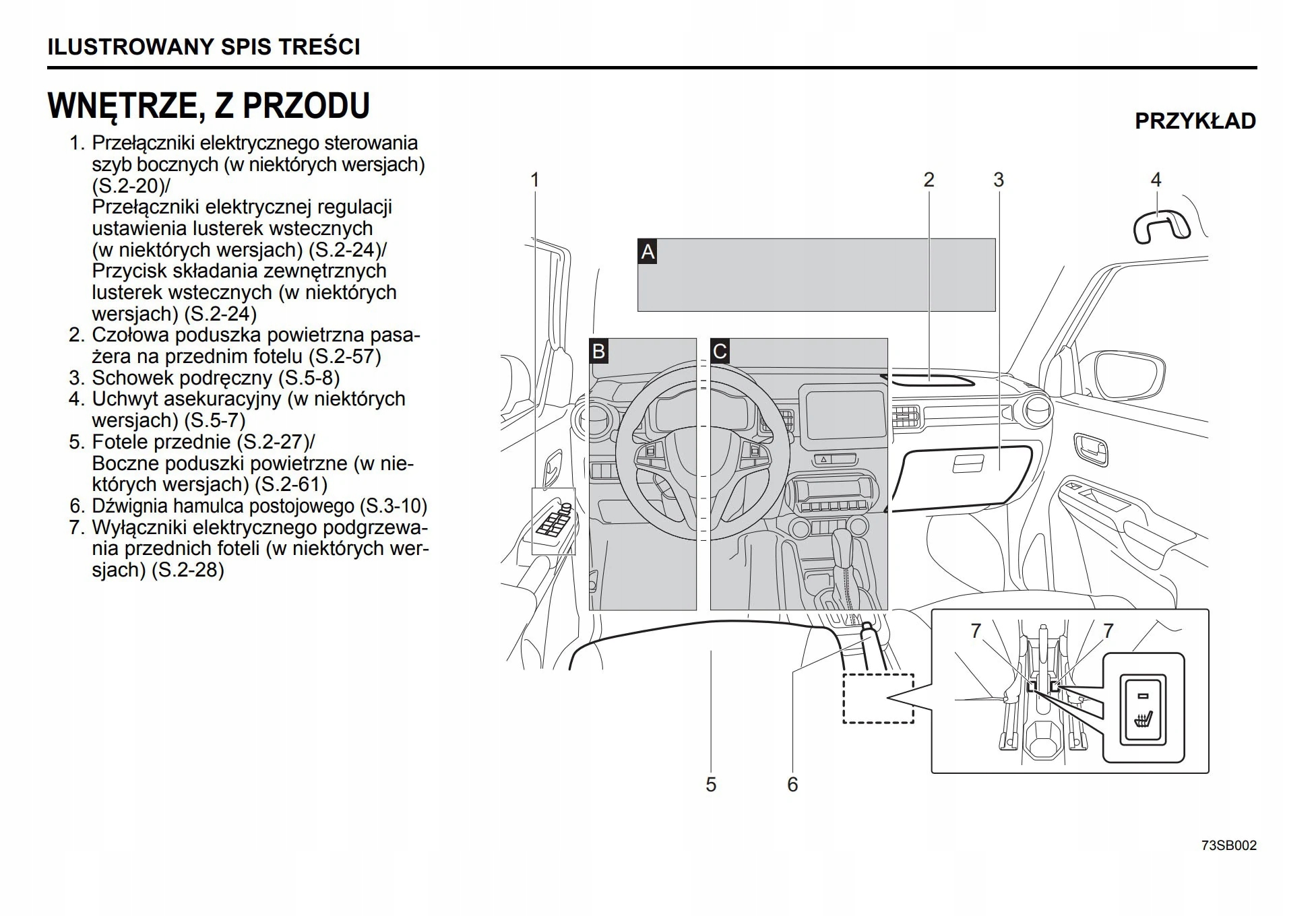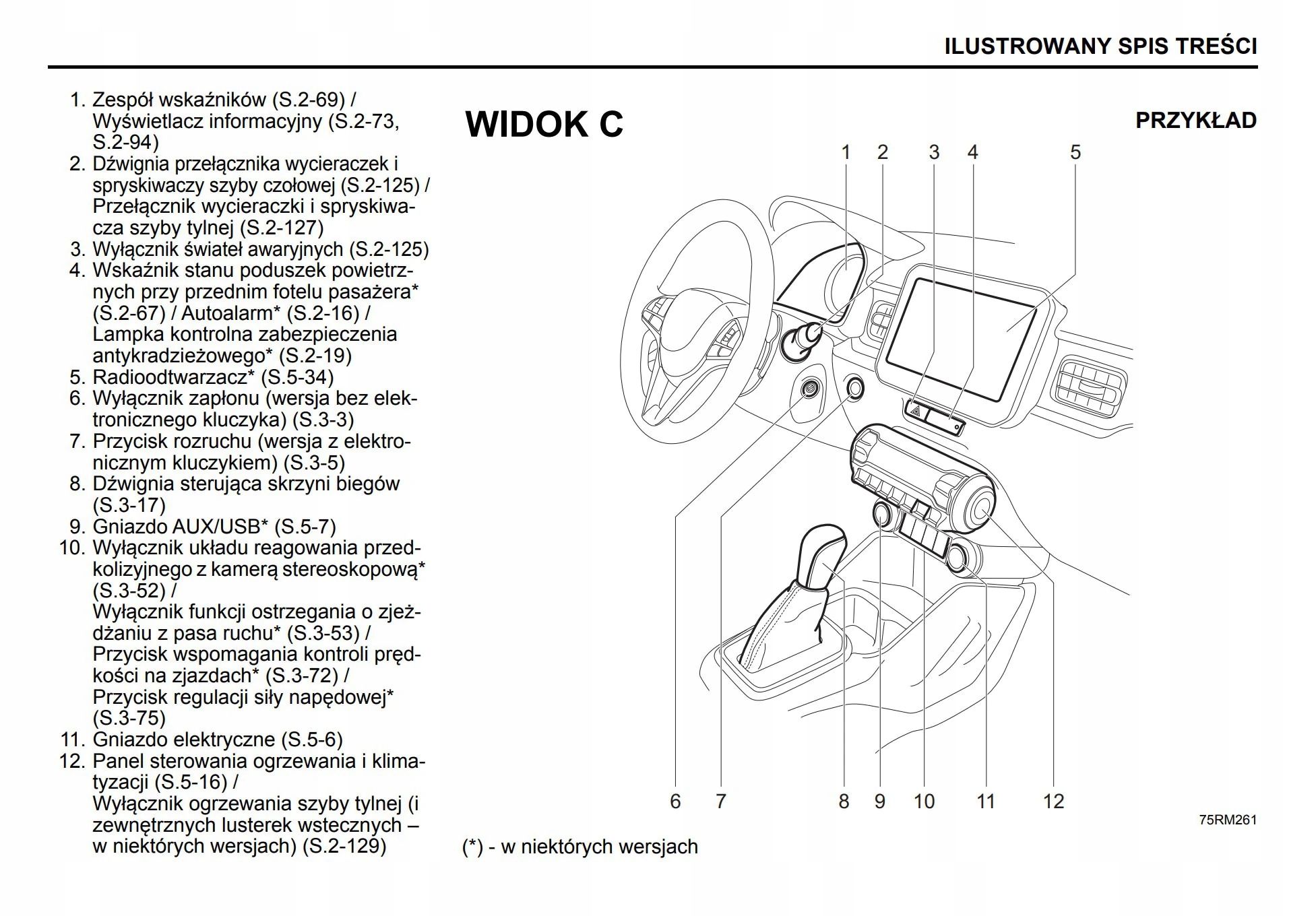 Руководство по эксплуатации Suzuki содержит все версии оборудования и полезную информацию о том, как эффективно и безопасно использовать автомобиль, например - индикаторы, контрольные лампы, открытие и закрытие - освещение и обзорность, сиденья, отсеки для хранения вещей, отопление, вентиляция, вентиляция кондиционирование - вождение, советы по эксплуатации, обслуживание автомобиля - уровни жидкостей, проверка и доливка, аварийные операции, замена колес, предохранителей, замена лампочек - технические данные... и многое другое, дающее путешественникам ощущение безопасности и комфорта. Польское законодательство обязывает продавца приложить к автомобилю руководство по эксплуатации на польском языке. Руководство пользователя автомобиля новое, на польском языке.