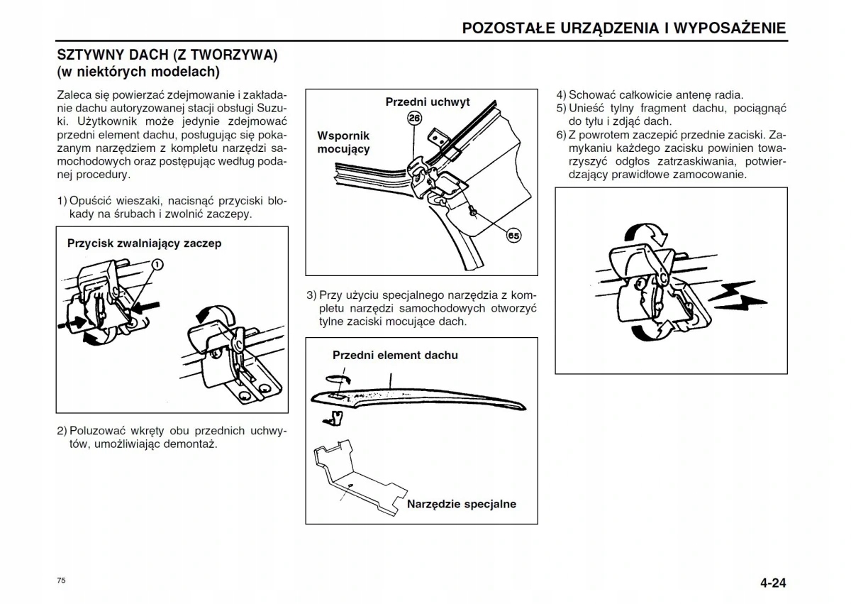 Руководство по эксплуатации Suzuki содержит все версии оборудования и полезную информацию о том, как эффективно и безопасно использовать автомобиль, например, индикаторы, контрольные лампы, освещение и обзорность, сиденья, отсеки для хранения вещей, отопление, вентиляцию, кондиционер. - советы по вождению, эксплуатации, обслуживанию автомобиля - уровни жидкостей, проверка и доливка, аварийные операции, замена колес, предохранителей, замена лампочек - технические данные... и многое другое, дающее путешественникам ощущение безопасности и комфорта. Польское законодательство обязывает продавца приложить к автомобилю руководство по эксплуатации на польском языке. Руководство пользователя автомобиля новое, на польском языке.