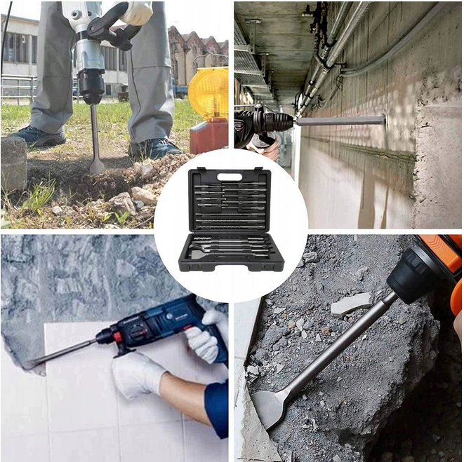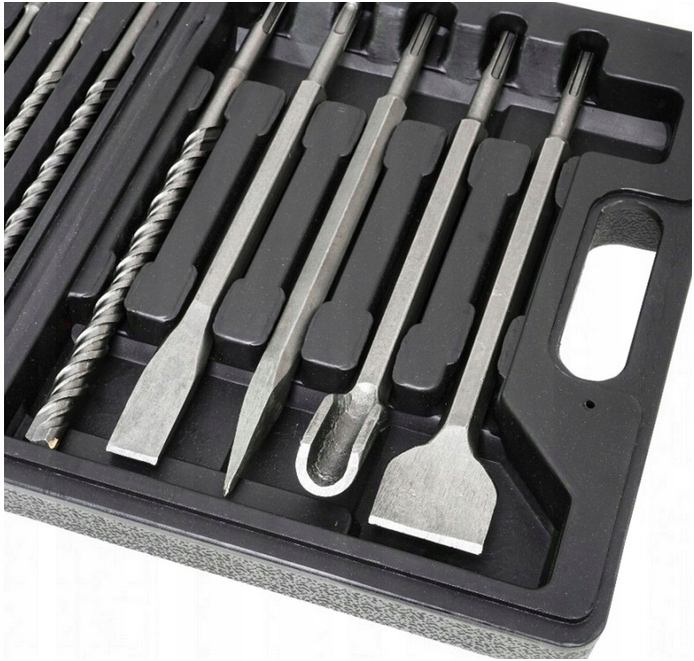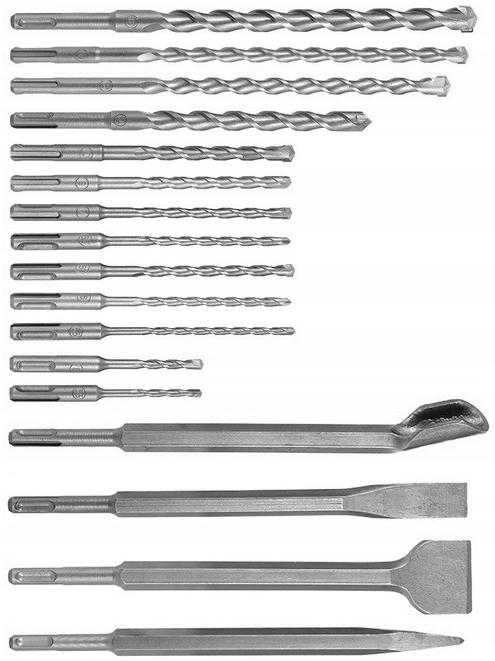 - Содержит самые необходимые размеры сверл SDS-PLUS по бетону и 4 долота различных размеров и форм – прекрасно дополняет аксессуары, необходимые для ковки и сверления.