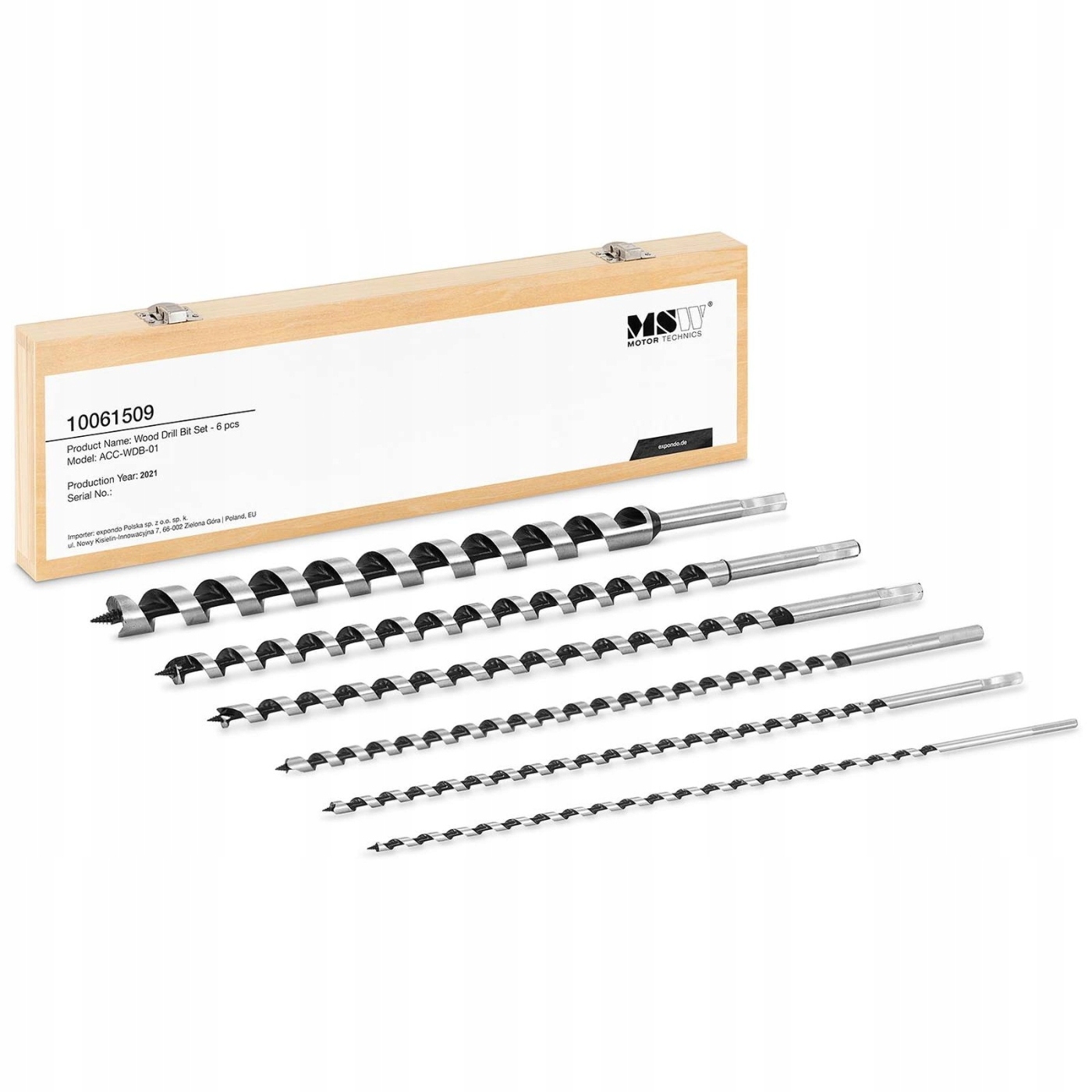 Набор из 6 штук подходит для различных работ. В набор входят сверла по дереву длиной 460 мм и диаметром 6, 8, 10, 12, 14, 16, 25 мм. Все элементы можно хранить в деревянном транспортировочном ящике.