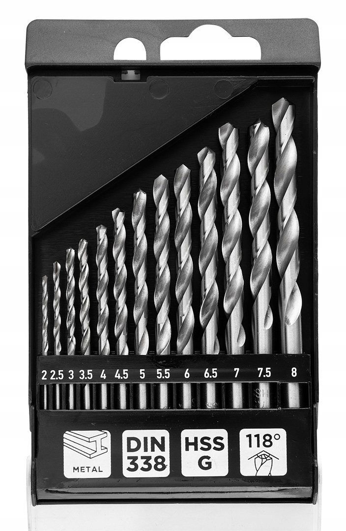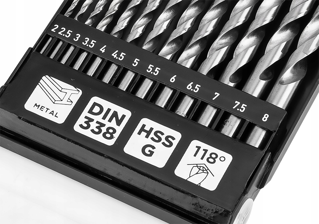Сверла по металлу HSS-G, 2 - 8 мм, набор из 13 шт., 54T940 от GRAPHITE - это сверла по металлу диаметром 2, 2,5, 3, 3,5, 4, 4,5, 5, 5,5, 6, 6,5, 7, 7,5, 8 мм. Они изготовлены из быстрорежущей стали HSS-G. Они имеют цилиндрическую рукоятку и угол заточки сверла 118°. Они соответствуют стандарту DIN 338 и подходят для каждого любителя DIY.