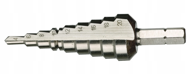 Качественное ступенчатое сверло. 9-ступенчатое сверло, размерный шаг каждые 2 мм, для материалов толщиной до 4,5 мм. С кромкоотрывателем для листового металла толщиной 1 мм. Шестигранный хвостовик 1/4" для державок по DIN ISO 1173-D 6.3.