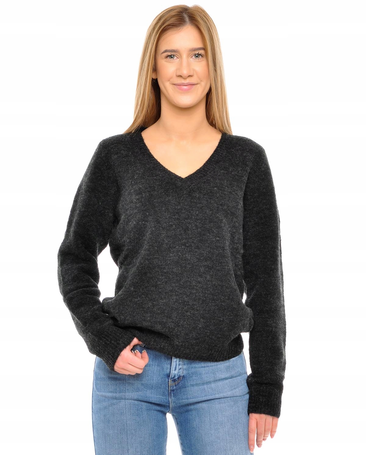 Женский пуловер-свитер. V-образный вырез. Манжеты отделаны эластичными манжетами. Серый цвет.