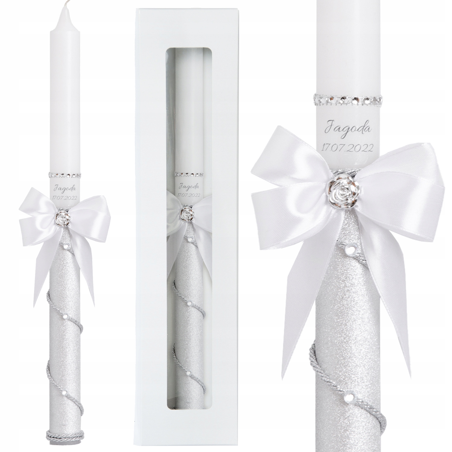 Красивая свеча для причастия, декорированная вручную. Подготовлено с величайшим чувством стиля. Изготовлен из компонентов высочайшего качества. Свеча, оформленная в универсальных серебряных тонах, которая идеально подойдет для празднования Первого Причастия, как девочкам, так и мальчикам. Очарования ей добавляет мотив в виде красивого белого атласного банта и серебряной нити, украшенной фианитами.